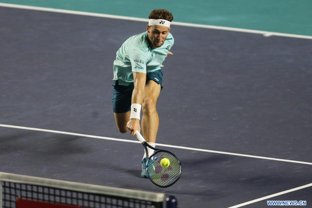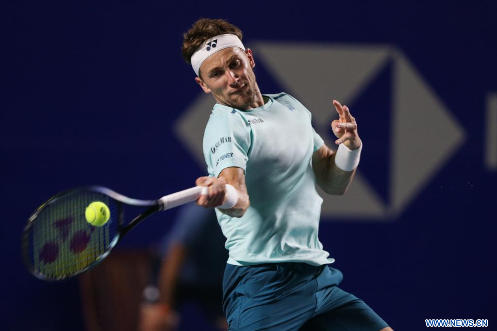 ACAPULCO, 1 marzo, 2024 (Xinhua) -- Casper Ruud, de Noruega, devuelve la pelota durante el partido de cuartos de final ante Ben Shelton, de Estados Unidos, en el torneo de tenis Abierto Mexicano 2024 de la ATP, en Acapulco, México, el 1 de marzo de 2024. (Xinhua/Francisco Cañedo)