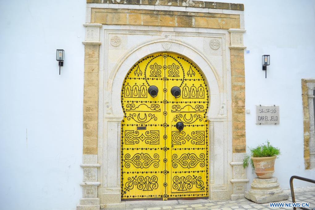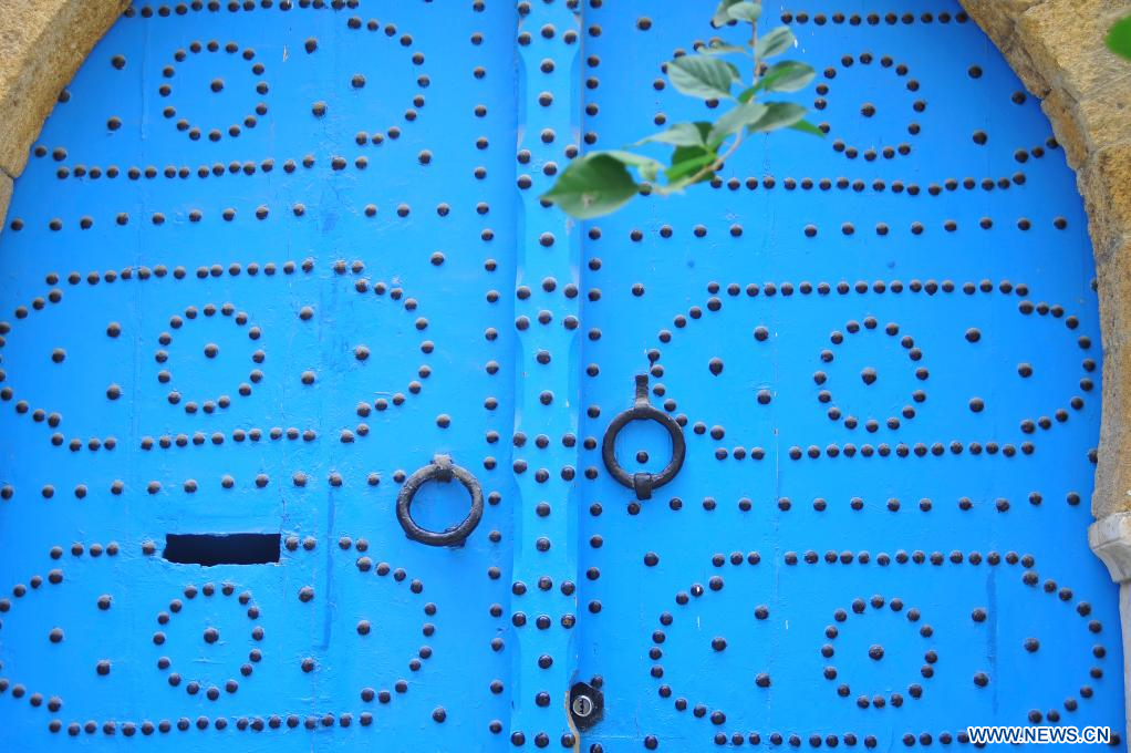 TUNEZ, 29 enero, 2024 (Xinhua) -- Imagen del 28 de enero de 2024 de una puerta de madera, en la ciudad vieja de Túnez, Túnez. La decoración de puertas de madera con remaches metálicos ha sido una tradición local en Túnez. (Xinhua/Adel Ezzine)