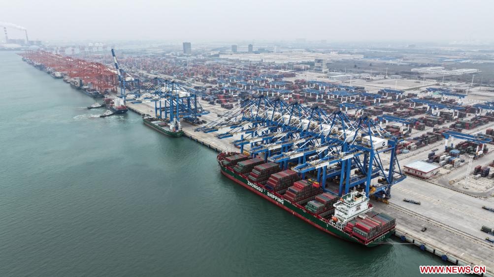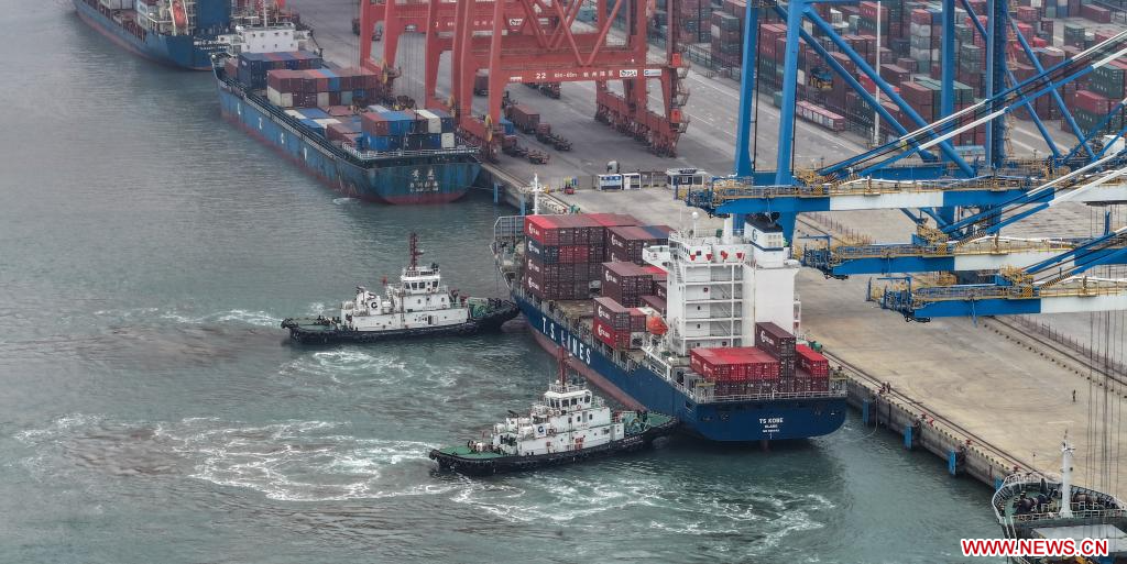 QINZHOU, 2 marzo, 2024 (Xinhua) -- Vista aérea tomada con un dron el 1 de marzo de 2024 de buques atracando para descargar en el puerto de Qinzhou, en la ciudad de Qinzhou, en la región autónoma de la etnia zhuang de Guangxi, en el sur de China. Unos 132.000 contenedores de mercancías equivalentes a veinte pies (TEU) han sido transportados en trenes intermodales ferroviarios-marítimos a través del Nuevo Corredor Internacional de Comercio Terrestre-Marítimo en los dos primeros meses del año, un aumento interanual del 10 por ciento, según datos de China Railway Nanning Group Co., Ltd. Lanzado en 2017, el Nuevo Corredor Internacional de Comercio Terrestre-Marítimo es un pasaje comercial y logístico construido por regiones de nivel provincial en el oeste de China y miembros de la ASEAN. (Xinhua/Zhang Ailin)