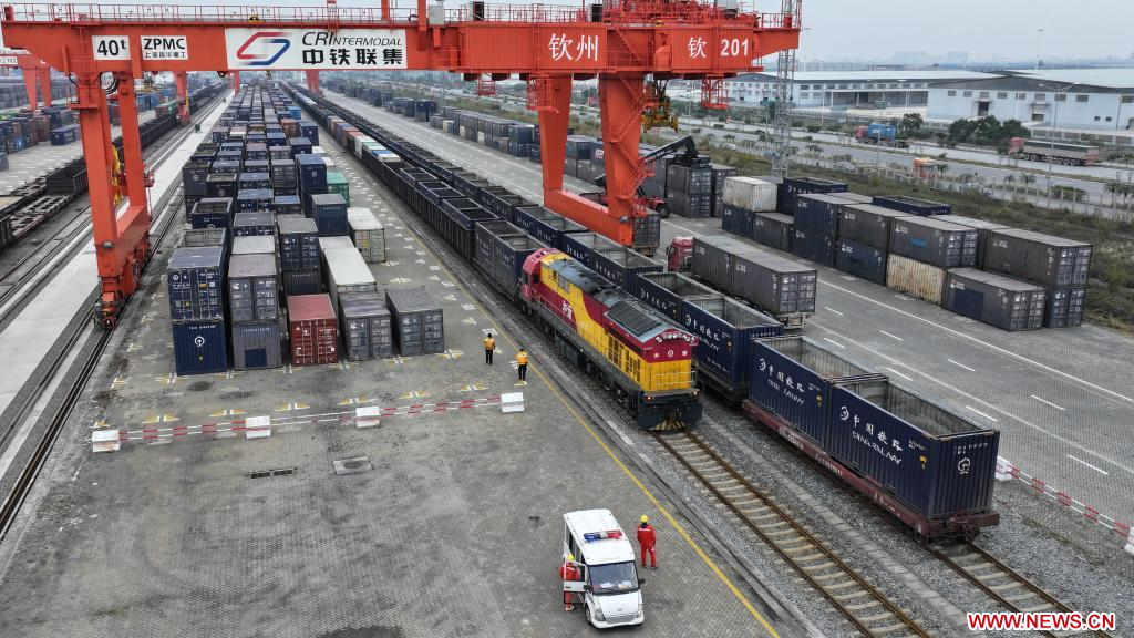 QINZHOU, 2 marzo, 2024 (Xinhua) -- Vista aérea tomada con un dron el 1 de marzo de 2024 de una terminal ferroviaria de contenedores, en la ciudad de Qinzhou, en la región autónoma de la etnia zhuang de Guangxi, en el sur de China. Unos 132.000 contenedores de mercancías equivalentes a veinte pies (TEU) han sido transportados en trenes intermodales ferroviarios-marítimos a través del Nuevo Corredor Internacional de Comercio Terrestre-Marítimo en los dos primeros meses del año, un aumento interanual del 10 por ciento, según datos de China Railway Nanning Group Co., Ltd. Lanzado en 2017, el Nuevo Corredor Internacional de Comercio Terrestre-Marítimo es un pasaje comercial y logístico construido por regiones de nivel provincial en el oeste de China y miembros de la ASEAN. (Xinhua/Zhang Ailin)