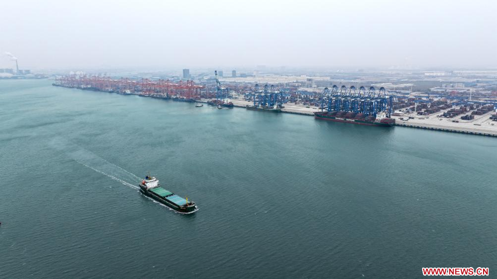 QINZHOU, 2 marzo, 2024 (Xinhua) -- Vista aérea tomada con un dron el 1 de marzo de 2024 de un buque acercándose al puerto de Qinzhou, en la ciudad de Qinzhou, en la región autónoma de la etnia zhuang de Guangxi, en el sur de China. Unos 132.000 contenedores de mercancías equivalentes a veinte pies (TEU) han sido transportados en trenes intermodales ferroviarios-marítimos a través del Nuevo Corredor Internacional de Comercio Terrestre-Marítimo en los dos primeros meses del año, un aumento interanual del 10 por ciento, según datos de China Railway Nanning Group Co., Ltd. Lanzado en 2017, el Nuevo Corredor Internacional de Comercio Terrestre-Marítimo es un pasaje comercial y logístico construido por regiones de nivel provincial en el oeste de China y miembros de la ASEAN. (Xinhua/Zhang Ailin)