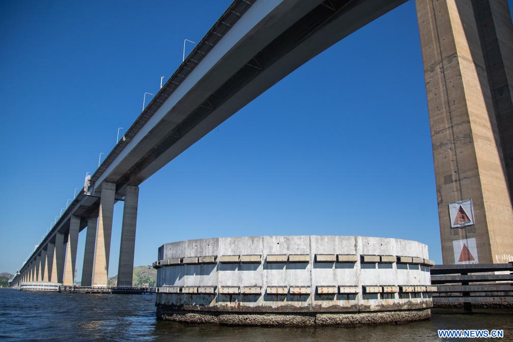 RÍO DE JANEIRO, 4 marzo, 2024 (Xinhua) -- Imagen del 4 de marzo de 2024 de una base de protección de un pilar (frente) del Puente Presidente Costa e Silva, también conocido como Puente Río-Niterói, durante el 50° aniversario de su inauguración, en la Bahía de Guanabara, en Río de Janeiro, Brasil. (Xinhua/Claudia Martini)