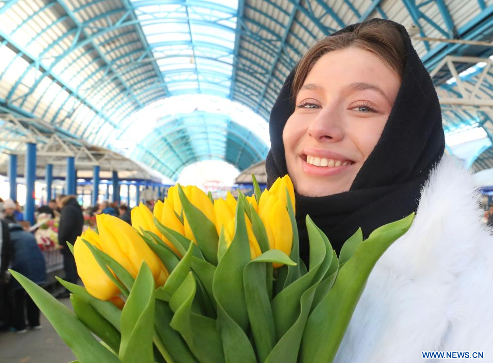 MINSK, 8 marzo, 2024 (Xinhua) -- Imagen del 7 de marzo de 2024 de una mujer posando para fotografías con flores en un mercado de flores en celebración del Día Internacional de la Mujer, en Minsk, Bielorrusia. (Xinhua/Henadz Zhinkov)