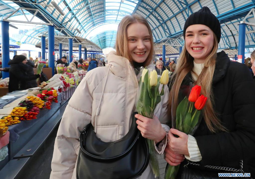 MINSK, 8 marzo, 2024 (Xinhua) -- Imagen del 7 de marzo de 2024 de personas visitando un mercado de flores en celebración del Día Internacional de la Mujer, en Minsk, Bielorrusia. (Xinhua/Henadz Zhinkov)