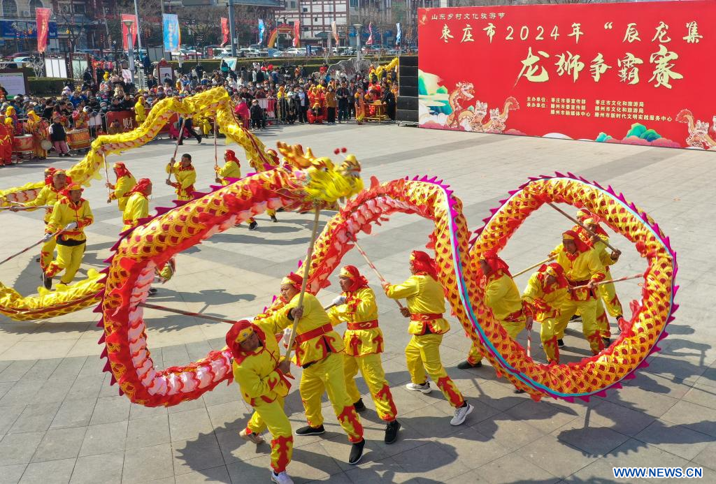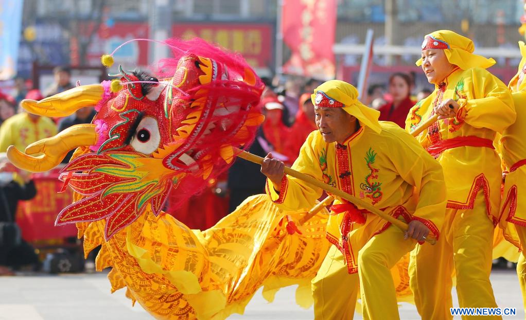 ZAOZHUANG, 9 marzo, 2024 (Xinhua) -- Artistas folclóricos ofrecen un espectáculo de danza del dragón, en la ciudad de Zaozhuang, provincia de Shandong, en el este de China, el 9 de marzo de 2024. Diversas celebraciones se llevaron a cabo por el próximo Día de Longtaitou, un día tradicional para un nuevo corte de pelo después de la Fiesta de la Primavera. El Día de Longtaitou, que literalmente significa "el dragón levanta la cabeza", cae en el segundo día del segundo mes lunar. (Xinhua/Song Haicun)