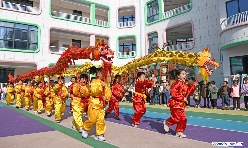 TAIZHOU, 9 marzo, 2024 (Xinhua) -- Imagen del 8 de marzo de 2024 de niños ofreciendo un espectáculo de danza del dragón en el jardín de infantes Yinghui, en el distrito de Xianju en la ciudad de Taizhou, provincia de Zhejiang, en el este de China. Diversas celebraciones se llevaron a cabo por el próximo Día de Longtaitou, un día tradicional para un nuevo corte de pelo después de la Fiesta de la Primavera. El Día de Longtaitou, que literalmente significa "el dragón levanta la cabeza", cae en el segundo día del segundo mes lunar. (Xinhua/Wang Huabin)