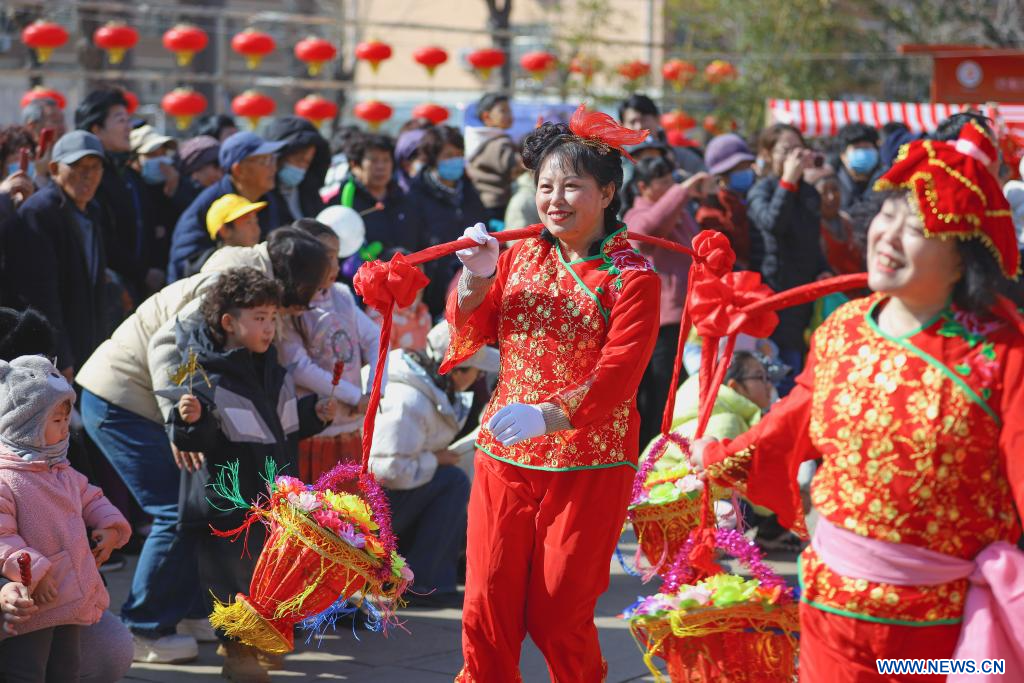 QINGDAO, 9 marzo, 2024 (Xinhua) -- Personas interpretan una danza folclórica yangge, en la comunidad de Dongli en el distrito de Licang en la ciudad de Qingdao, provincia de Shandong, en el este de China, el 9 de marzo de 2024. Diversas celebraciones se llevaron a cabo por el próximo Día de Longtaitou, un día tradicional para un nuevo corte de pelo después de la Fiesta de la Primavera. El Día de Longtaitou, que literalmente significa "el dragón levanta la cabeza", cae en el segundo día del segundo mes lunar. (Xinhua/Zhang Ying)