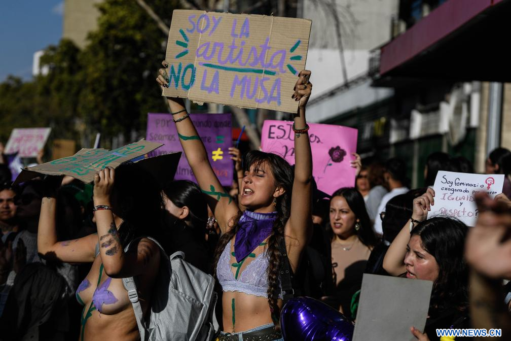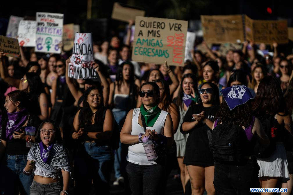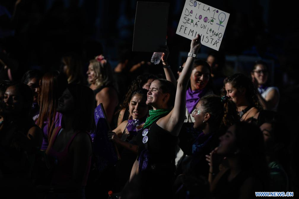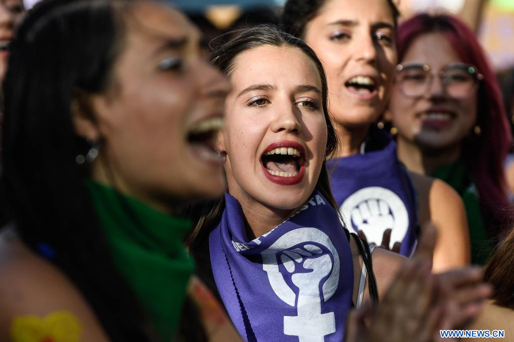 SANTIAGO, 9 marzo, 2024 (Xinhua) -- Imagen del 8 de marzo de 2024 de mujeres participando en una manifestación en el marco de la conmemoración del Día Internacional de la Mujer, en Santiago, capital de Chile. (Xinhua/Jorge Villegas)