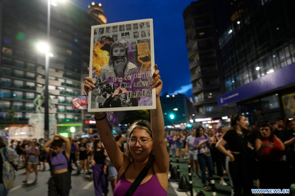 MONTEVIDEO, 9 marzo, 2024 (Xinhua) -- Imagen del 8 de marzo de 2024 de una mujer sosteniendo una pancarta durante una manifestación en el marco de la conmemoración del Día Internacional de la Mujer, en Montevideo, capital de Uruguay. (Xinhua/Nicolás Celaya)