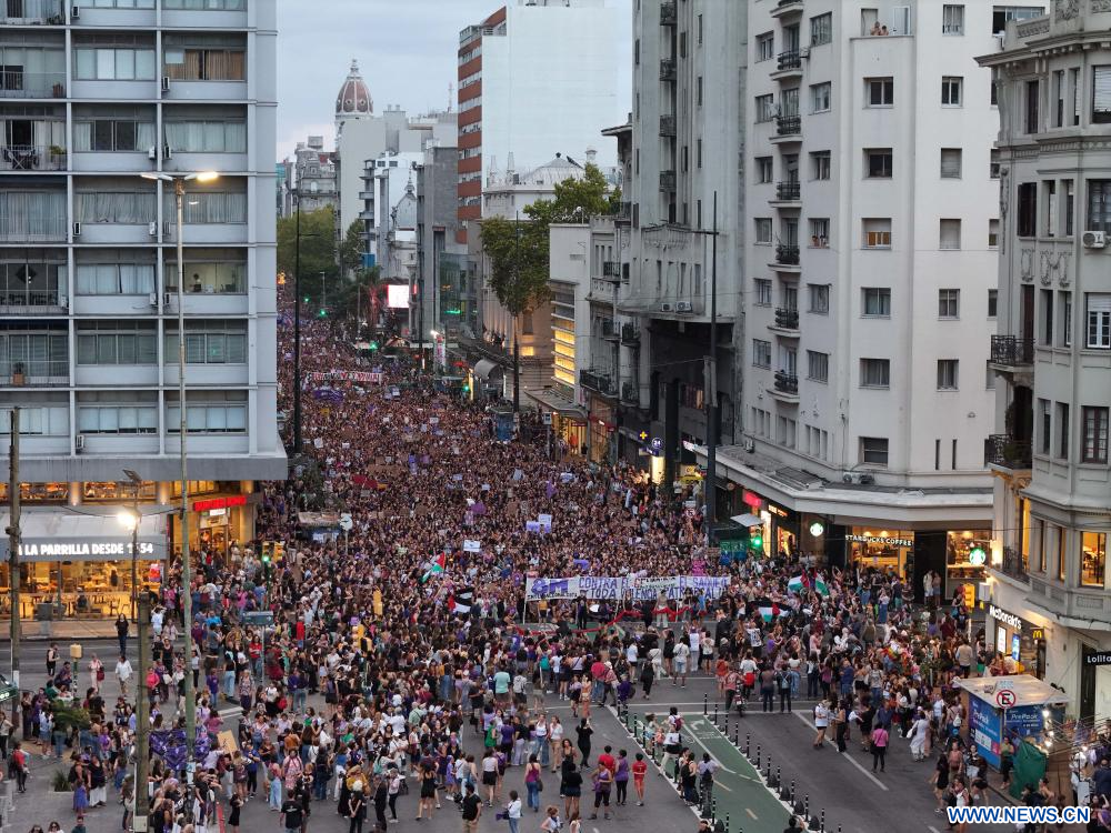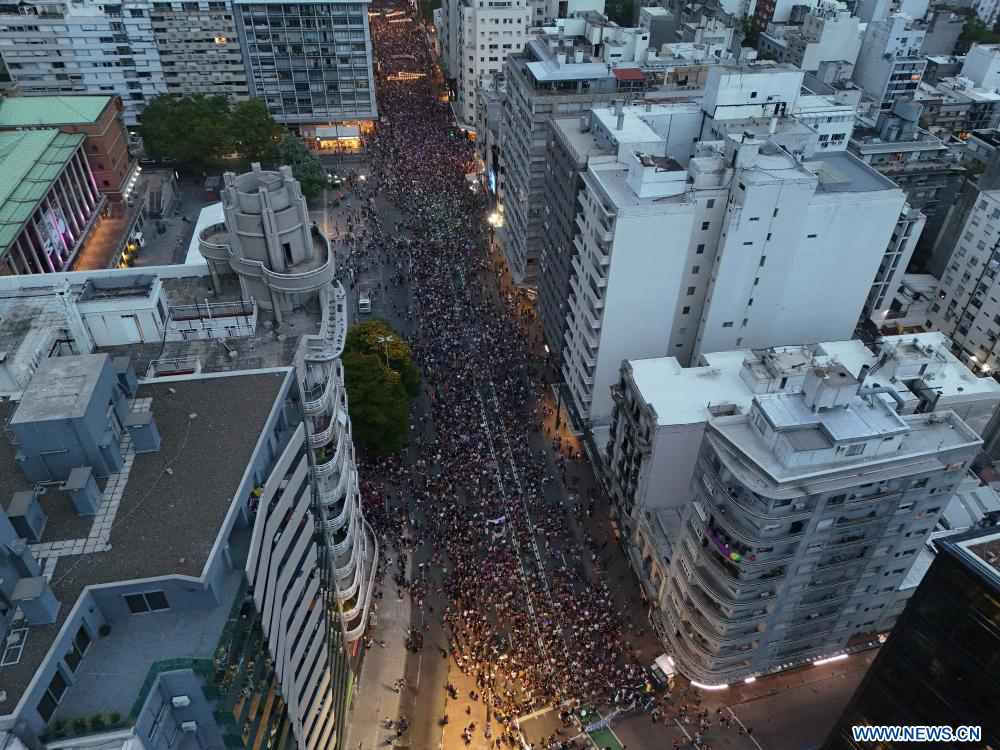 MONTEVIDEO, 9 marzo, 2024 (Xinhua) -- Imagen tomada con un dron el 8 de marzo de 2024 de mujeres participando en una manifestación en el marco de la conmemoración del Día Internacional de la Mujer, en Montevideo, capital de Uruguay. (Xinhua/Nicolás Celaya)