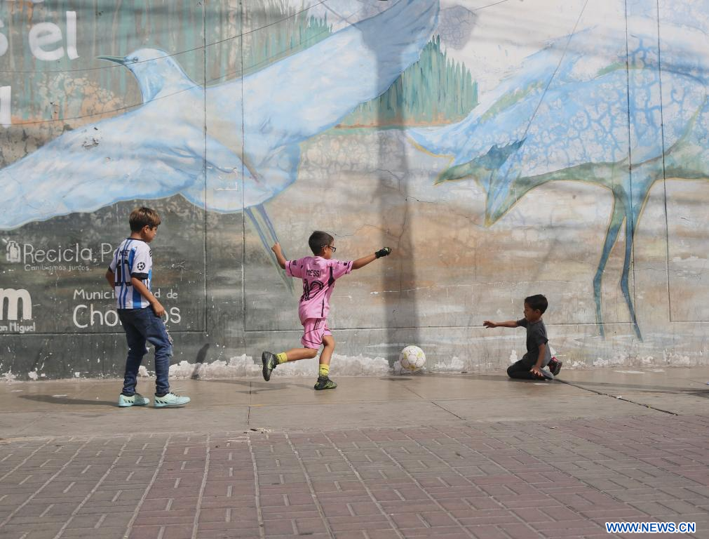 LIMA, 26 febrero, 2024 (Xinhua) -- Niños juegan fútbol en una calle comercial, en el distrito de Chorrillos, en el sur de Lima, Perú, el 26 de febrero de 2024. (Xinhua/Mariana Bazo)