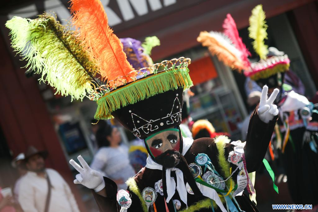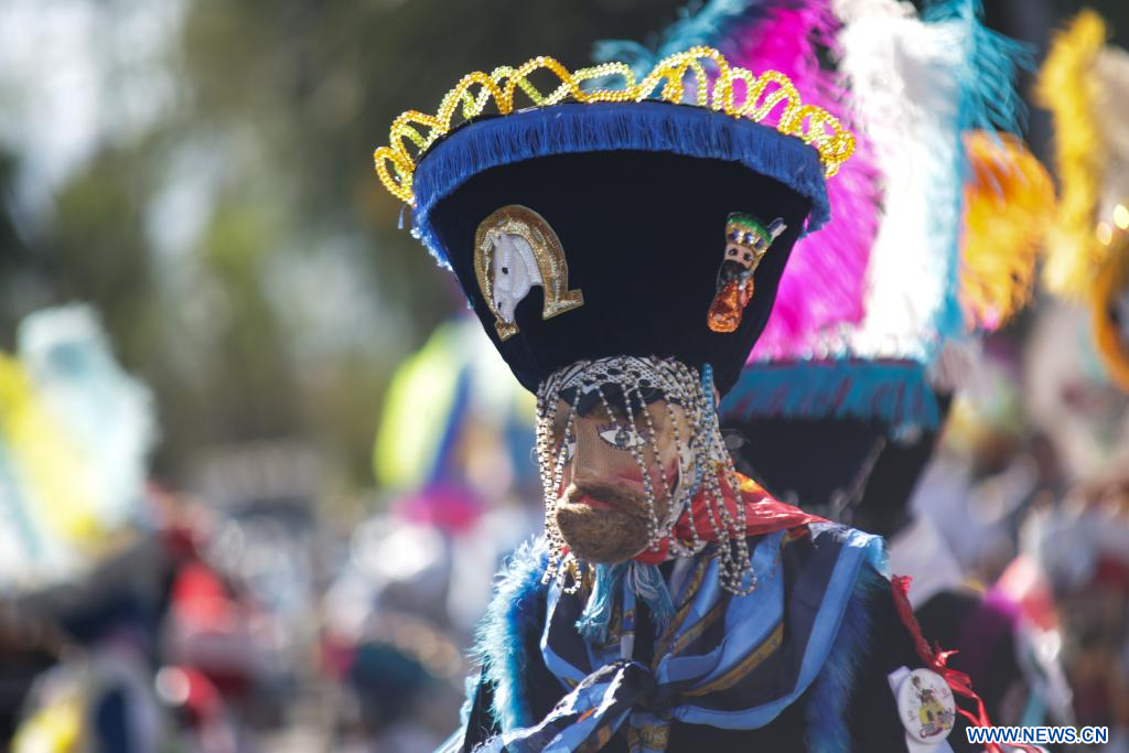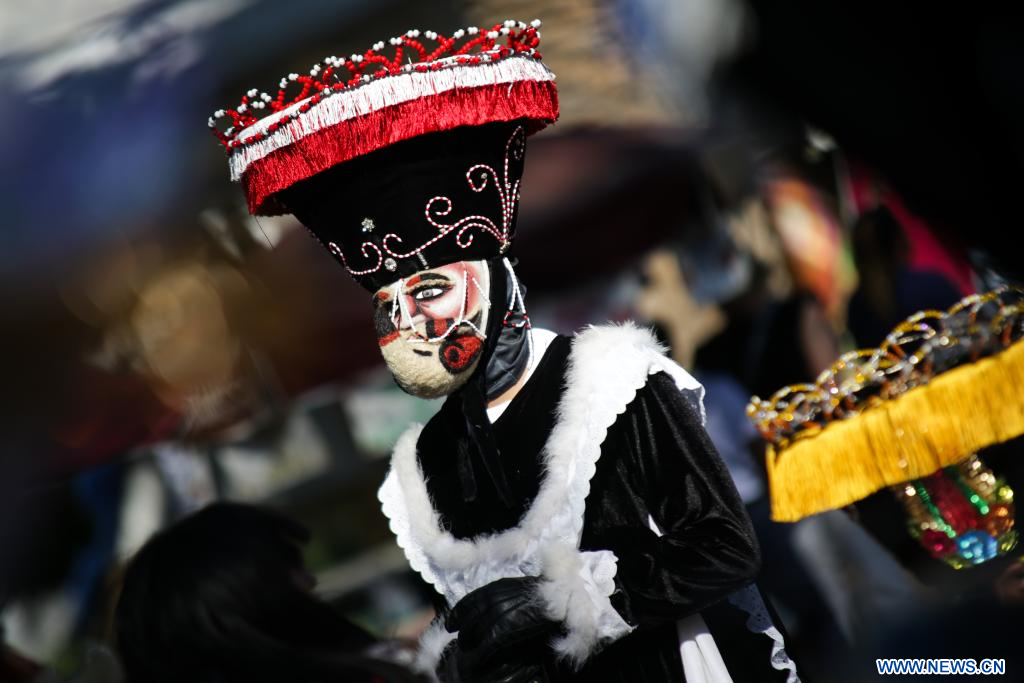 CIUDAD DE MÉXICO, 9 marzo, 2024 (Xinhua) -- Imagen del 8 de marzo de 2024 de una persona disfrazada participando en el Carnaval de Xochimilco 2024, en Xochimilco, en la Ciudad de México, México. Los desfiles de carnaval han sido una larga tradición en el pequeño poblado suburbano de Xochimilco, en la capital mexicana, donde los participantes en trajes exóticos, máscaras y sombreros bailan al ritmo de la música en las calles. (Xinhua/Francisco Cañedo)
