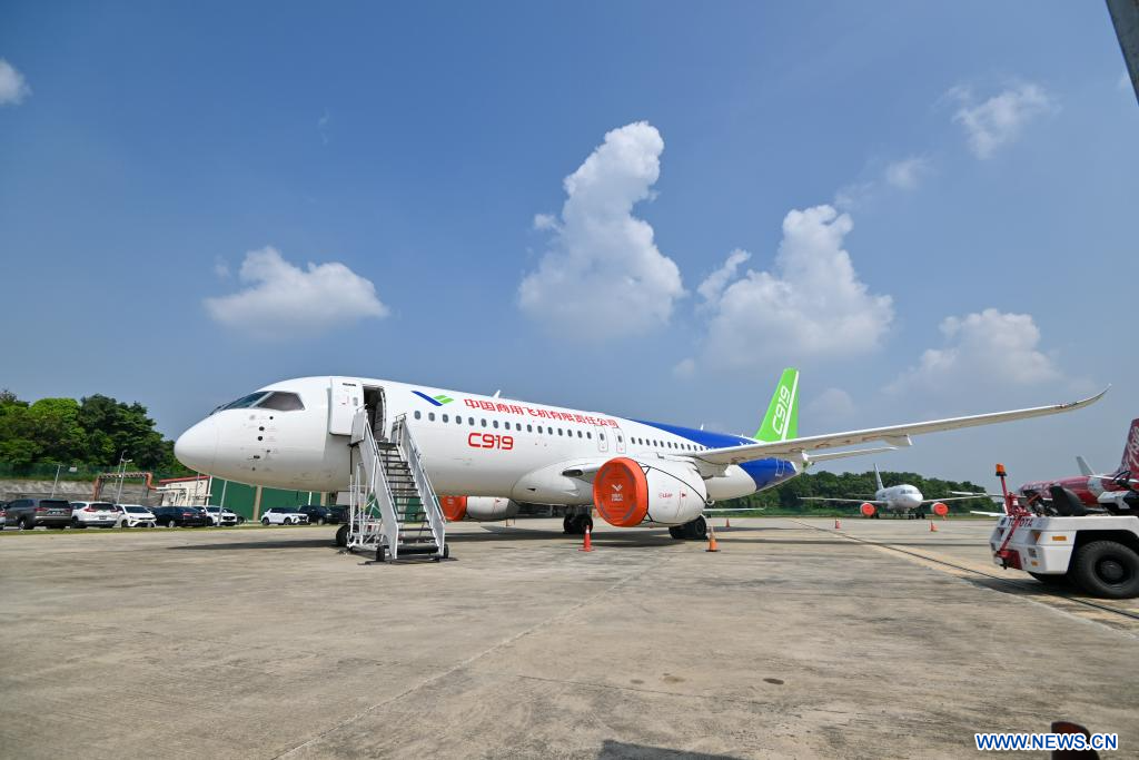 KUALA LUMPUR, 13 marzo, 2024 (Xinhua) -- Imagen del 13 de marzo de 2024 de un avión comercial C919, fabricado por Commercial Aircraft Corporation of China, Ltd. (COMAC), en exhibición en el Aeropuerto Sultan Abdul AzizShah, en el estado de Selangor, Malasia. La exhibición estática y el vuelo de demostración de los aviones comerciales ARJ21 y C919 fabricados en China se llevaron a cabo aquí el miércoles. (Xinhua/Chong Voon Chung)
