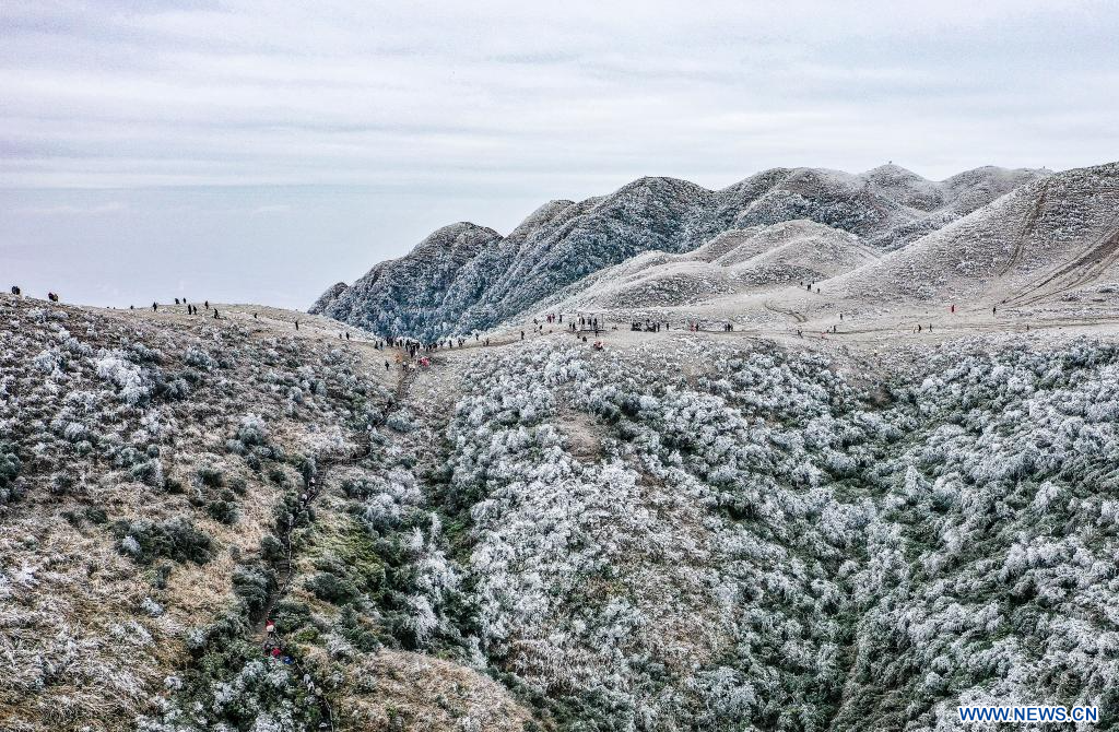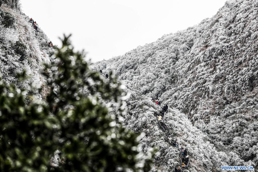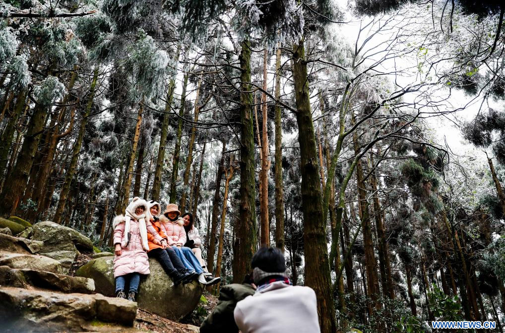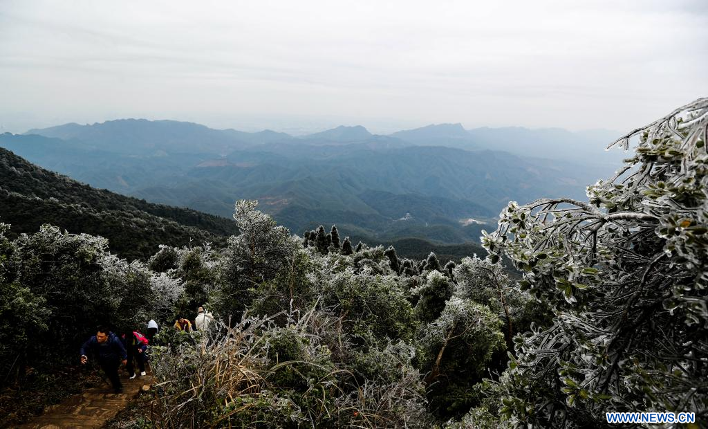 Turistas visitan Parque Forestal Nacional Pingtianshan en Guangxi