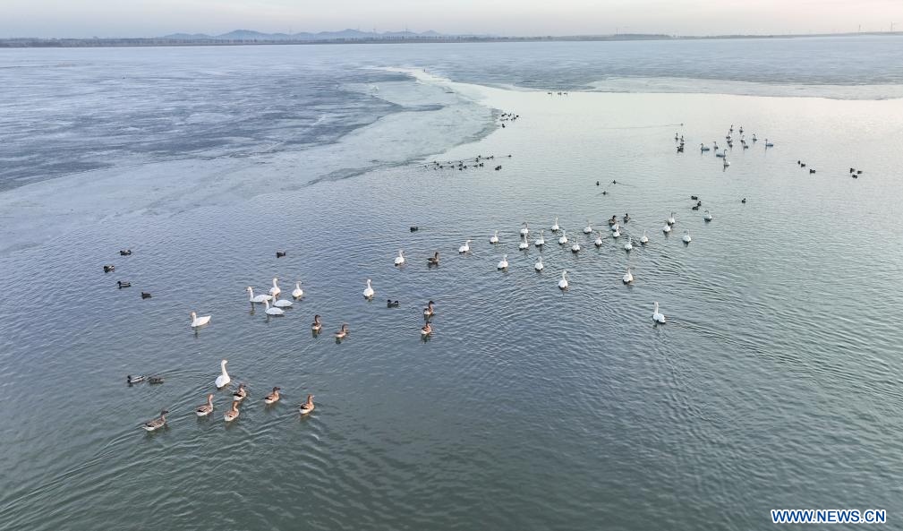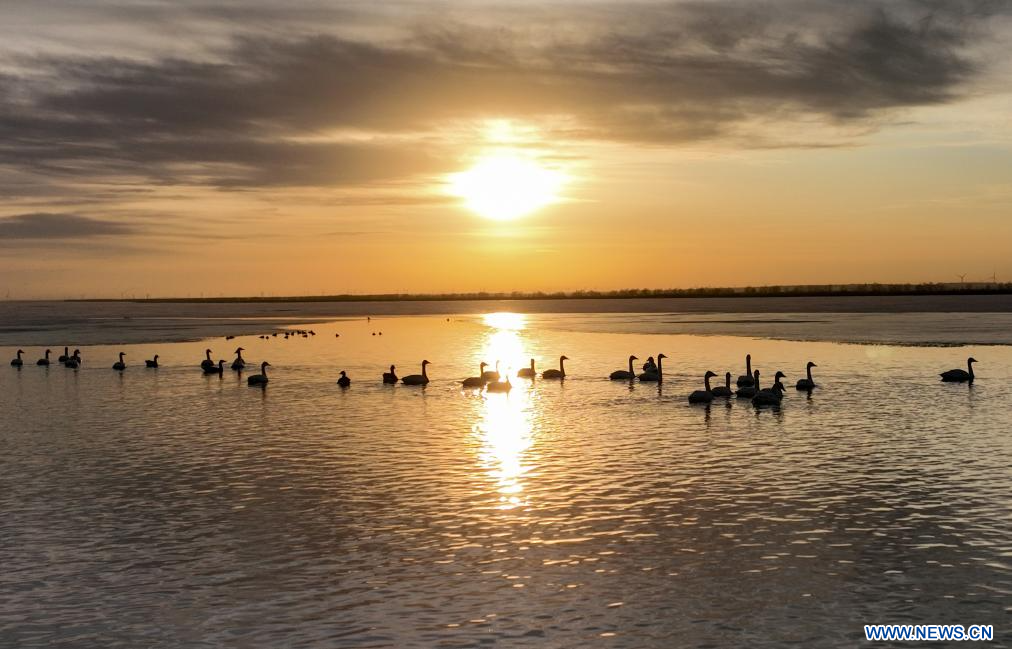 SHENYANG, 13 marzo, 2024 (Xinhua) -- Imagen tomada con un dron el 13 de marzo de 2024 de aves migratorias en el humedal del lago Wolong, en el distrito de Kangping de Shenyang, capital de la provincia de Liaoning, en el noreste de China. (Xinhua/Long Lei)