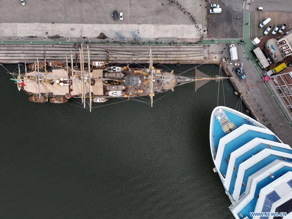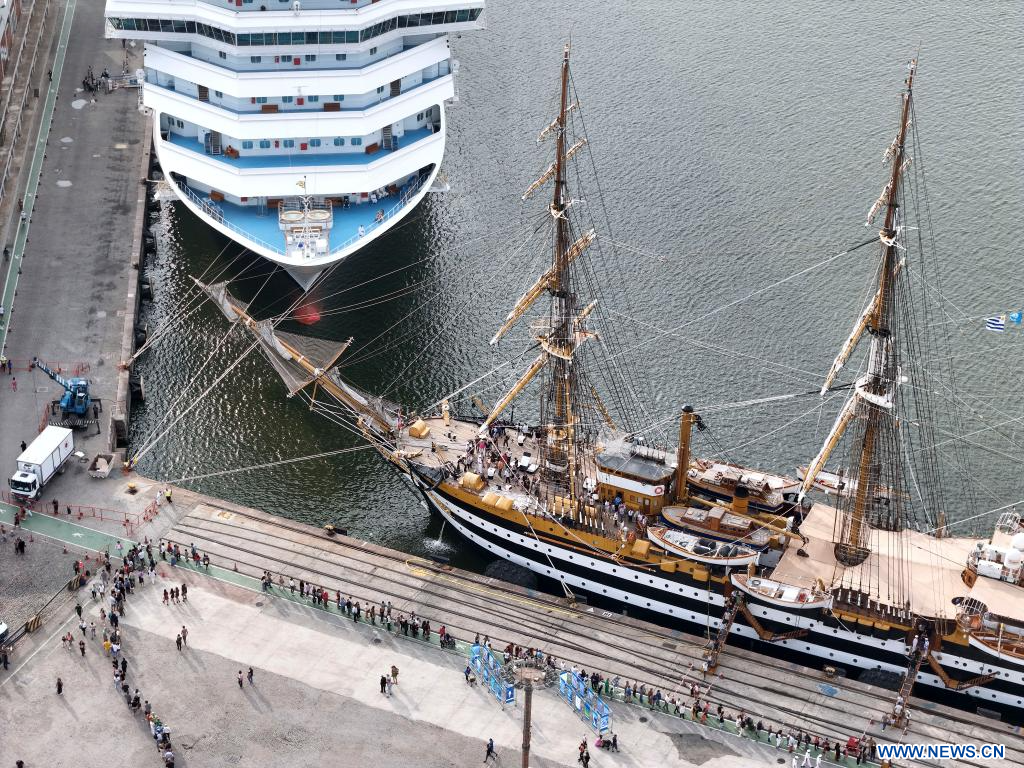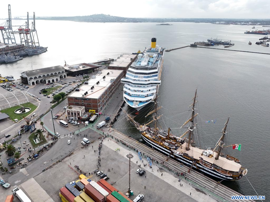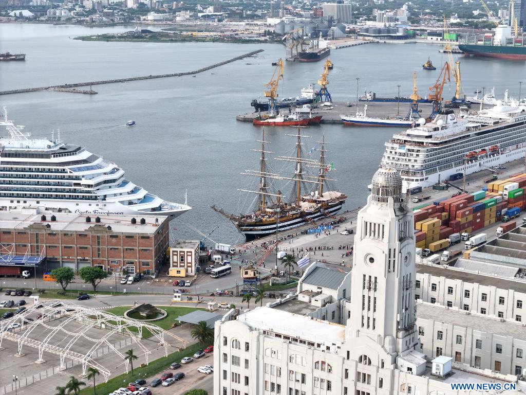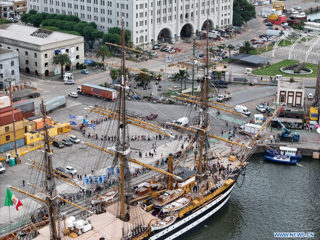 MONTEVIDEO, 15 marzo, 2024 (Xinhua) -- Imagen tomada con un dron del buque Escuela de la Marina italiana Amerigo Vespucci atracado durante su visita a Uruguay, en el comienzo de la segunda etapa de una vuelta al mundo que comenzó en junio de 2023, en el puerto de Montevideo, en Montevideo, capital de Uruguay, el 15 de marzo de 2024. (Xinhua/Nicolás Celaya)