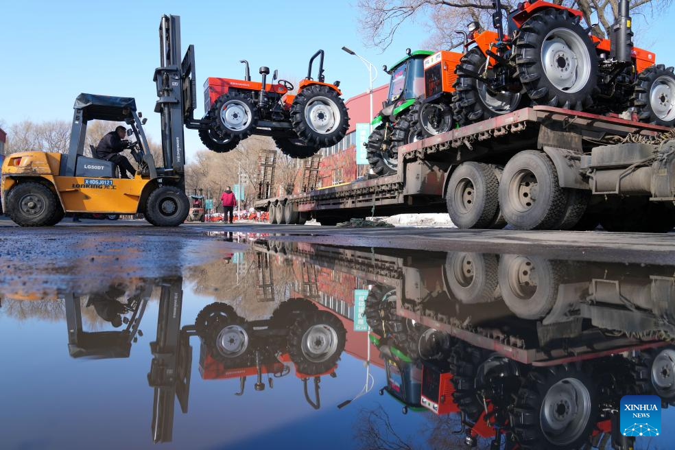HARBIN, 14 marzo, 2024 (Xinhua) -- Imagen del 12 de marzo de 2024 de un empleado operando una carretilla elevadora para cargar un tractor sobre un camión en una empresa de fabricación de tractores, en Jiamusi, en la provincia de Heilongjiang, en el noreste de China. En Heilongjiang, la principal provincia productora de cereales de China, conocida como el "granero de cereales" del país, las empresas fabricantes de maquinaria agrícola se están preparando para satisfacer la demanda del mercado para la temporada de arado de primavera de este año. En la ciudad de Jiamusi, como la práctica de la labranza científica y el uso de maquinaria agrícola inteligente se ha convertido en una nueva tendencia este año, a la fabricación de maquinaria agrícola ahora se le añaden más elementos de alta tecnología, como la aplicación del sistema de navegación por satélite Beidou. (Xinhua/Wang Jianwei)