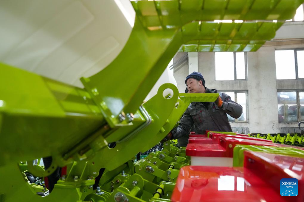 HARBIN, 14 marzo, 2024 (Xinhua) -- Imagen del 12 de marzo de 2024 de un empleado ensamblando una sembradora en el taller de una empresa de fabricación de maquinaria agrícola, en Jiamusi, en la provincia de Heilongjiang, en el noreste de China. En Heilongjiang, la principal provincia productora de cereales de China, conocida como el "granero de cereales" del país, las empresas fabricantes de maquinaria agrícola se están preparando para satisfacer la demanda del mercado para la temporada de arado de primavera de este año. En la ciudad de Jiamusi, como la práctica de la labranza científica y el uso de maquinaria agrícola inteligente se ha convertido en una nueva tendencia este año, a la fabricación de maquinaria agrícola ahora se le añaden más elementos de alta tecnología, como la aplicación del sistema de navegación por satélite Beidou. (Xinhua/Wang Jianwei)