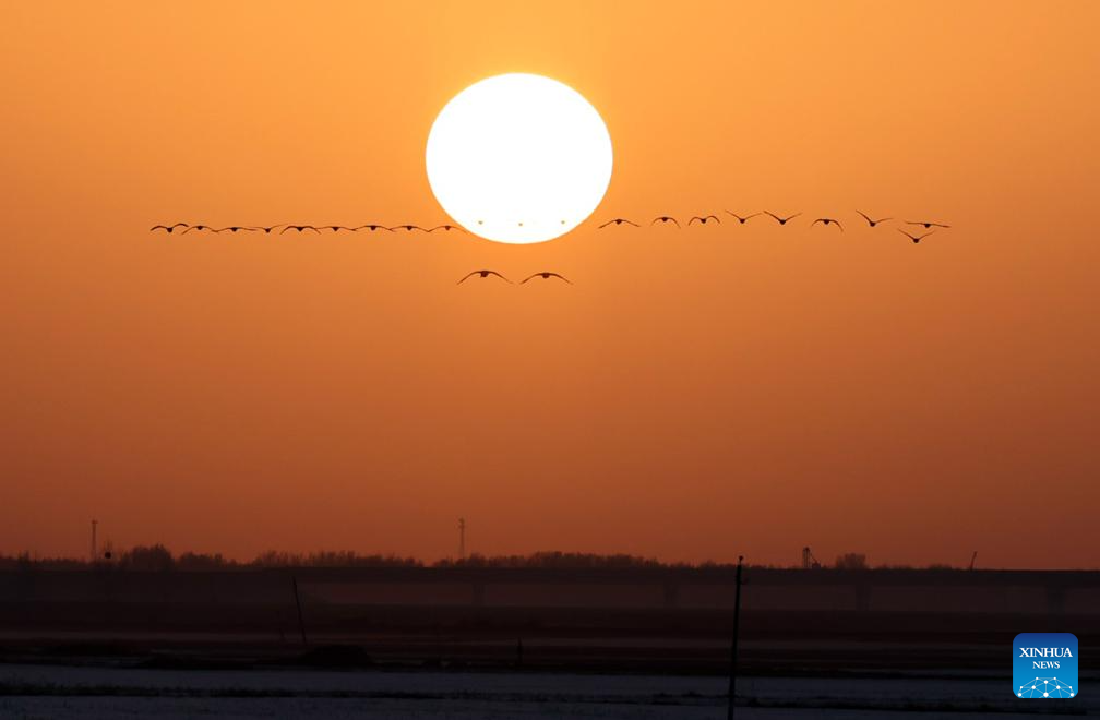 HOHHOT, 14 marzo, 2024 (Xinhua) -- Imagen del 13 de marzo de 2024 de aves volando en medio del atardecer en un banco de arena del Río Amarillo al pie de la montaña Yinshan, en la región autónoma de Mongolia Interior, en el norte de China. (Xinhua/Jia Lijun)