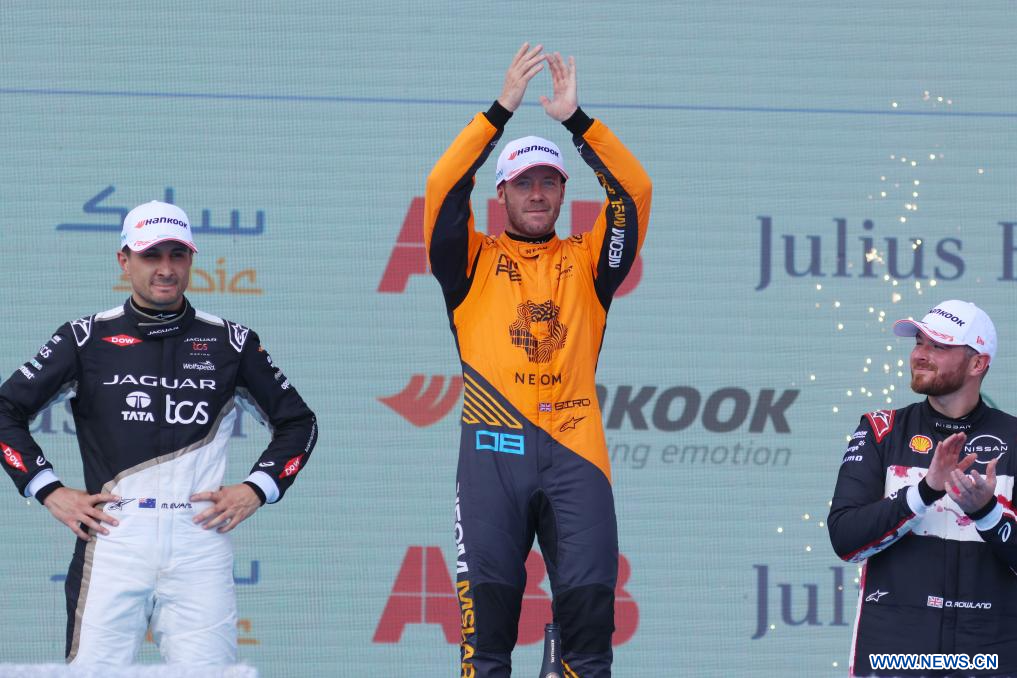 SAO PAULO, 16 marzo, 2024 (Xinhua) -- El piloto británico de la escudería Neom McLaren, Sam Bird (i), festeja al término del E-Prix de Sao Paulo de Fórmula E, en Sao Paulo, Brasil, el 16 de marzo de 2024. (Xinhua/Rahel Patrasso)