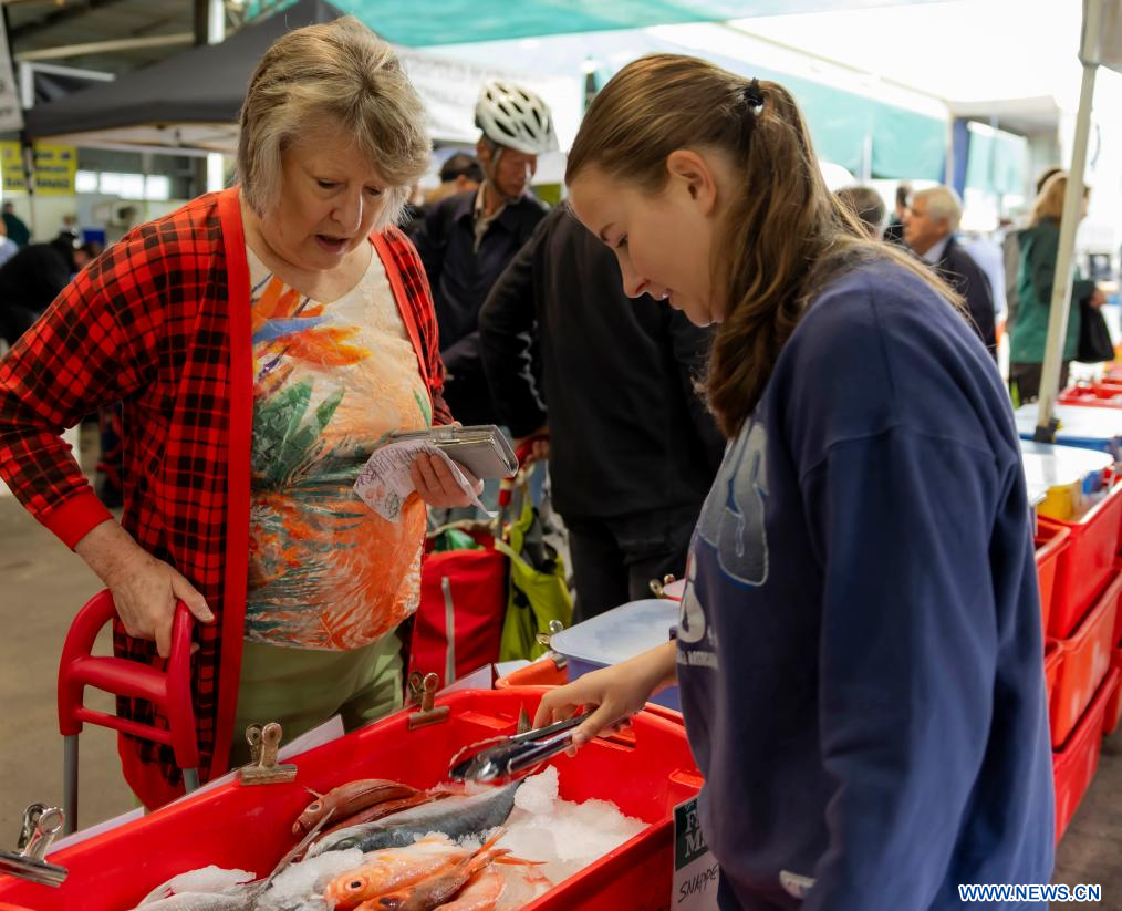 CANBERRA, 16 marzo, 2024 (Xinhua) -- Una mujer compra pescado en el Mercado de Agricultores de la Región Capital en el Parque de Exposiciones, en Canberra, Australia, el 16 de marzo de 2024. Este año se conmemora el 20 aniversario del Mercado de Agricultores de la Región Capital. Todos los sábados por la mañana, el mercado reúne a más de 100 vendedores de toda Australia, con sus productos recién recolectados, cultivados y hechos a mano. (Xinhua/Chu Chen)