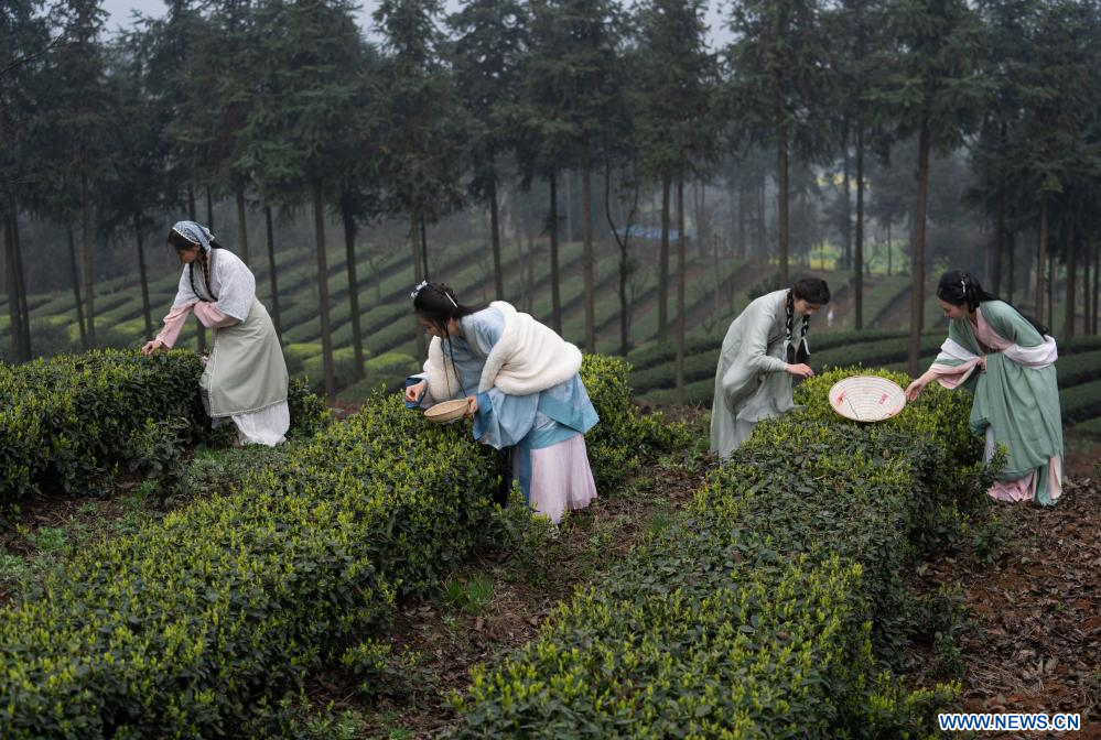 LUZHOU, 11 marzo, 2024 (Xinhua) -- Imagen del 10 de marzo de 2024 de turistas portando trajes tradicionales, conocidos como Hanfu, recogiendo hojas de té, en la aldea Meiling del distrito de Naxi, en la ciudad de Luzhou, en la provincia de Sichuan, en el suroeste de China. En los últimos años, el distrito de Naxi ha desarrollado vigorosamente la plantación de té a principios de primavera y ha promovido el desarrollo del turismo del té. Con una superficie total de plantación de té de 315.000 mu (21.000 hectáreas), el distrito de Naxi puede producir 23.000 toneladas de hojas de té al año, beneficiando a más de 5.600 hogares y cultivando más de 100 empresas de procesamiento de té. (Xinhua/Jiang Hongjing)