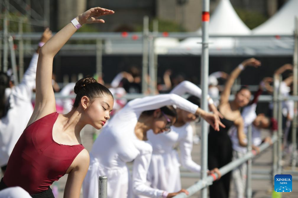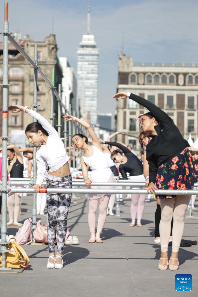CIUDAD DE MÉXICO, 18 marzo, 2024 (Xinhua) -- Imagen del 17 de marzo de 2024 de personas participando en una clase masiva de ballet dirigida por la bailarina Elisa Carrillo, en el Zócalo, en la Ciudad de México, capital de México. (Xinhua/Francisco Cañedo)