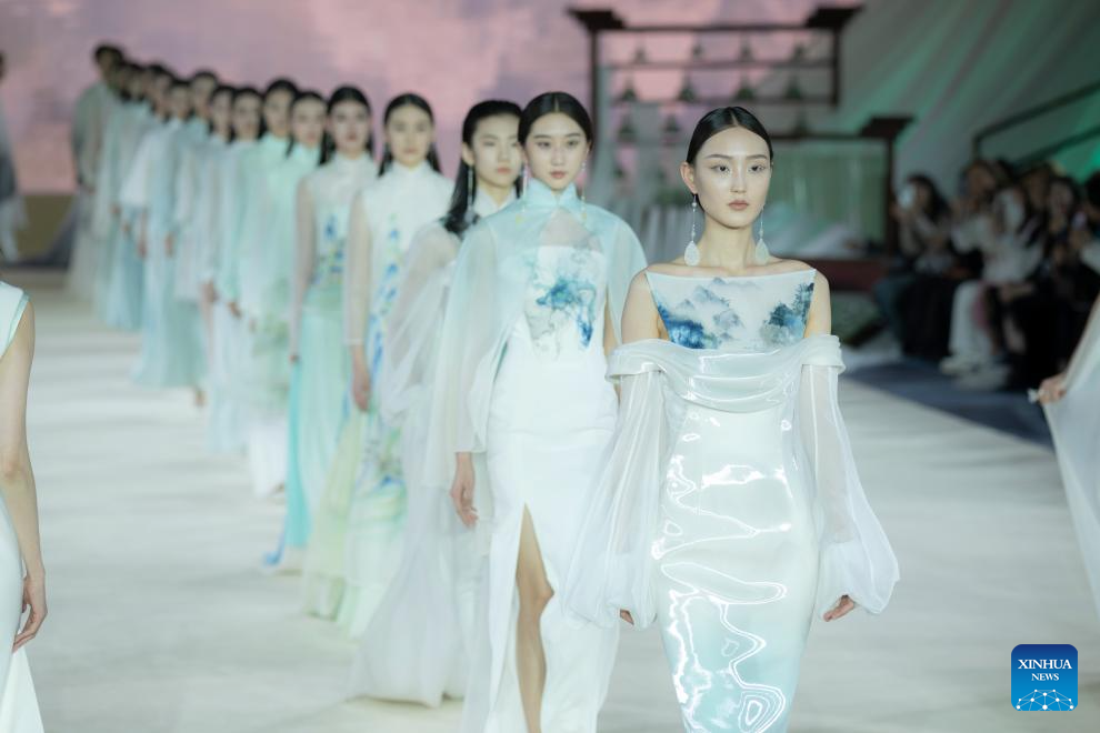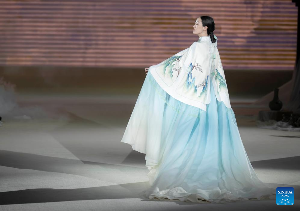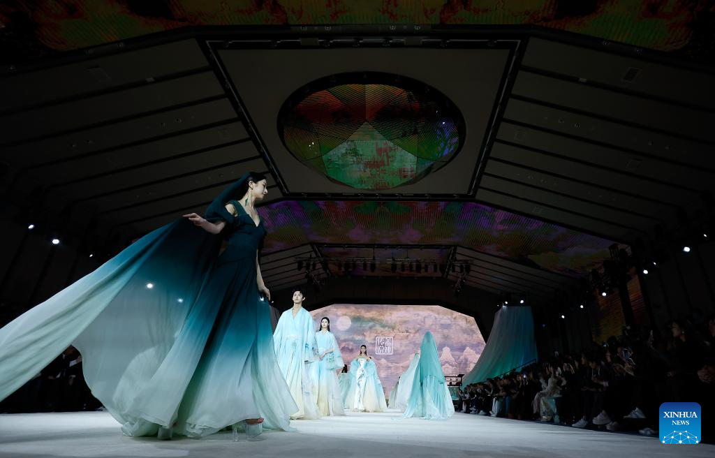 BEIJING, 18 marzo, 2024 (Xinhua) -- Modelos caminan por la pasarela del desfile de la colección de Heaven Gaia Otoño/Invierno 2024 de la diseñadora de moda china, Xiong Ying, durante la Semana de la Moda de Beijing AW2024, en Beijing, capital de China, el 18 de marzo de 2024. El desfile de Heaven Gaia inauguró la Semana de la Moda de Beijing AW2024 el lunes. (Xinhua/Wang Lili)