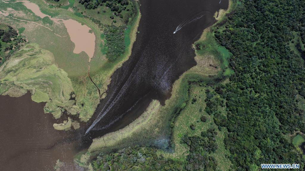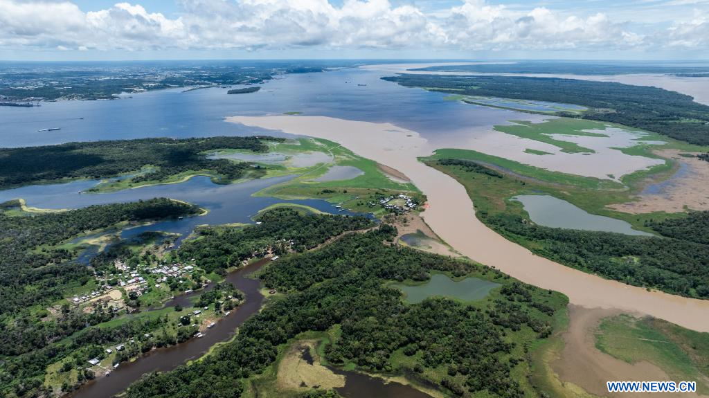 MANAOS, 15 marzo, 2024 (Xinhua) -- Vista aérea tomada con un dron el 14 de marzo de 2024 de la cuenca afluente del río Amazonas, cerca de Manaos, capital del estado de Amazonas, Brasil. (Xinhua/Wang Tiancong)