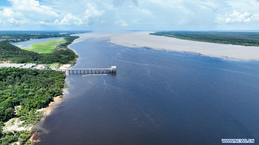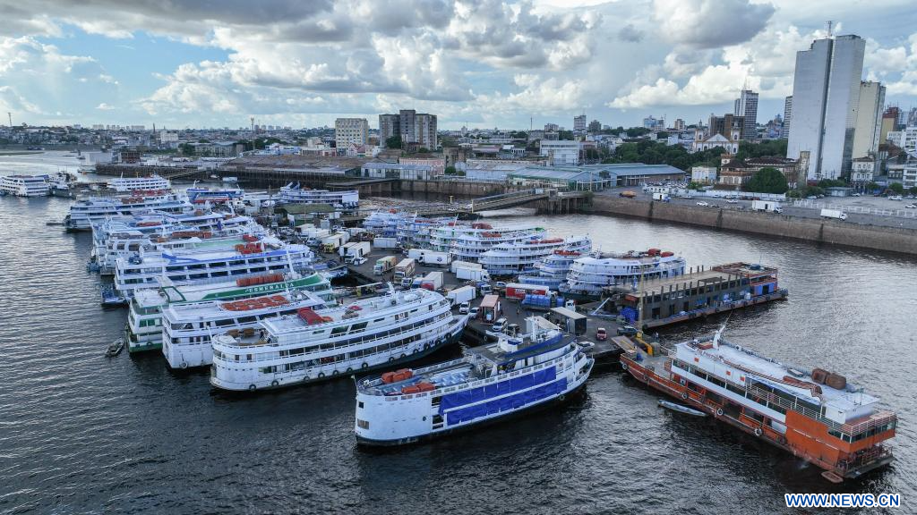 MANAOS, 15 marzo, 2024 (Xinhua) -- Vista aérea tomada con un dron el 12 de marzo de 2024 de un muelle de cruceros, en Manaos, capital del estado de Amazonas, Brasil. (Xinhua/Wang Tiancong)