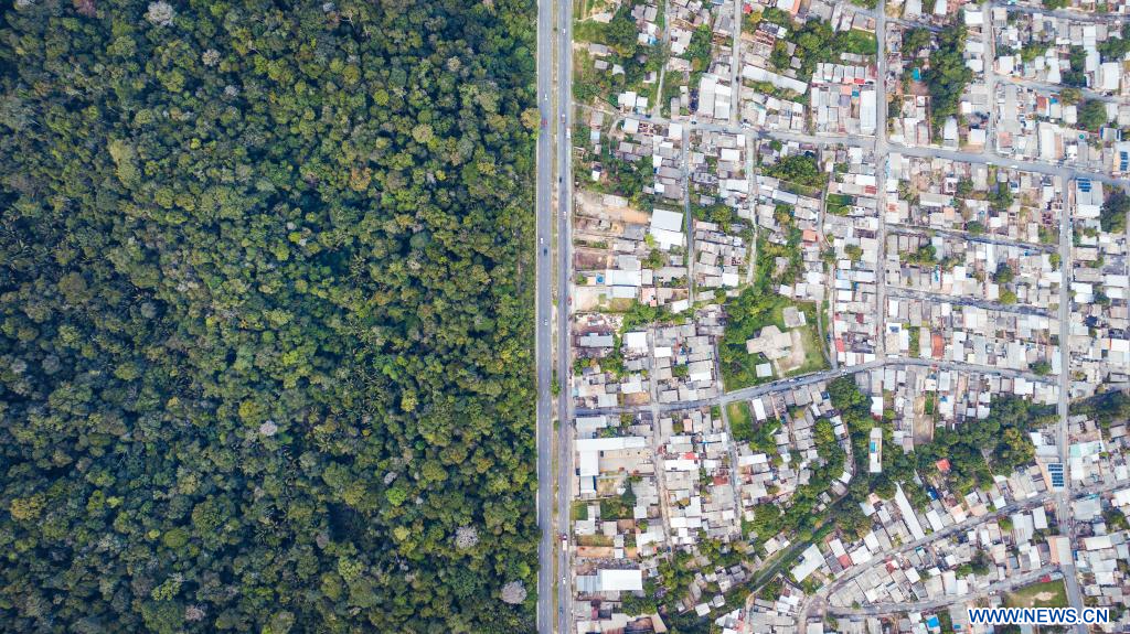 MANAOS, 15 marzo, 2024 (Xinhua) -- Vista aérea tomada con un dron el 13 de marzo de 2024 de la frontera entre el área residencial y la selva tropical, en Manaos, capital del estado de Amazonas, Brasil. (Xinhua/Wang Tiancong)
