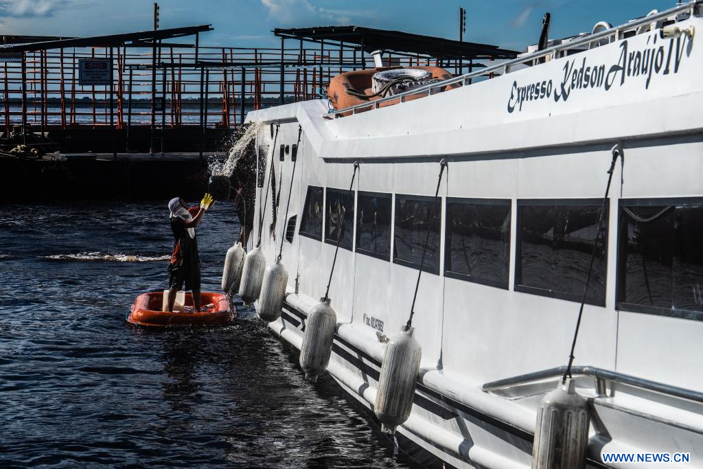 MANAOS, 15 marzo, 2024 (Xinhua) -- Imagen del 14 de marzo de 2024 de un marinero limpiando un barco turístico en un muelle, en Manaos, capital del estado de Amazonas, Brasil. (Xinhua/Wang Tiancong)