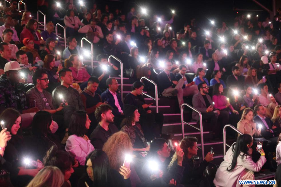 Imagen del 21 de marzo de 2024 de personas asistiendo a la ceremonia de inauguración de la décima versión del festival "Smartfilms", en Bogotá, Colombia. El lanzamiento de la décima versión del "Smartfilms", uno de los festivales de cine realizado con aparatos celulares más relevantes del mundo, se llevó a cabo la noche del jueves en un teatro de la ciudad de Bogotá, con una nutrida asistencia de participantes. (Xinhua/Zhou Shengping)