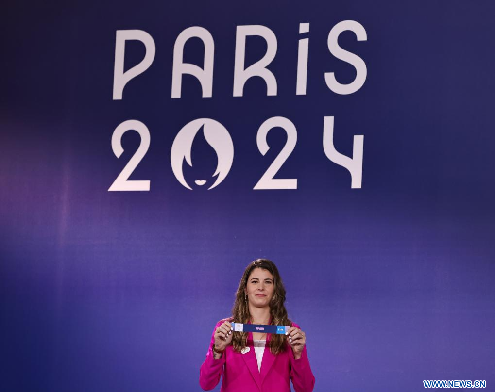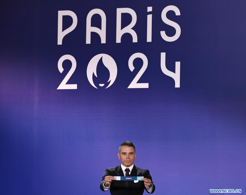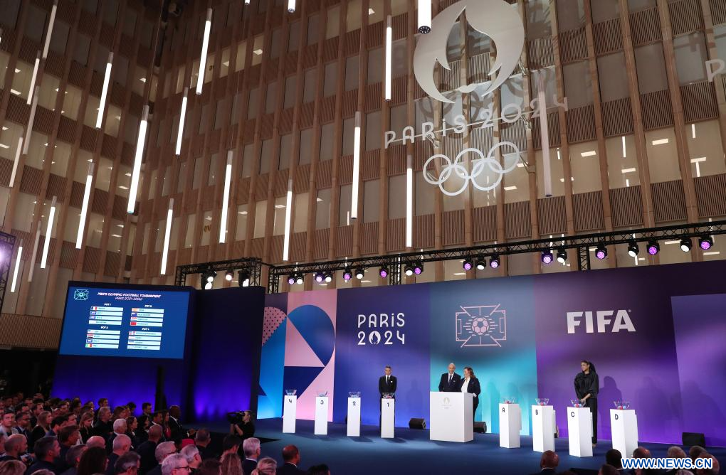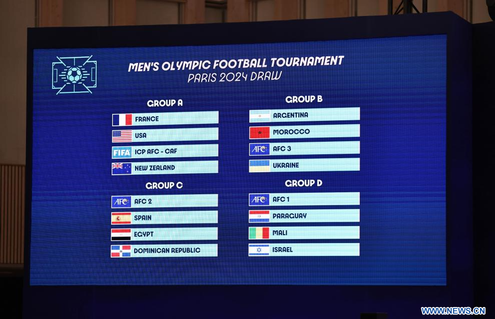 SAINT-DENIS, 21 marzo, 2024 (Xinhua) -- Imagen del 20 de marzo de 2024 del sorteo para los torneos masculinos de fútbol de los Juegos Olímpicos de París 2024 visto durante la ceremonia de sorteo para los torneos de fútbol de los Juegos Olímpicos de París 2024 en la sede de París 2024, en Saint-Denis, cerca de París, Francia. (Xinhua/Gao Jing)