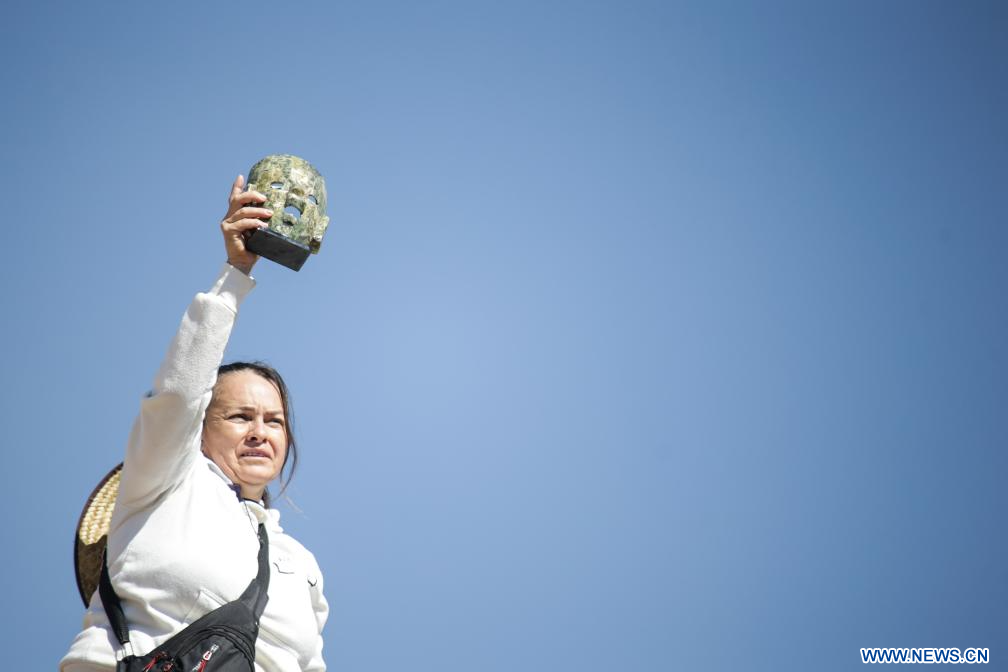 TEOTIHUACAN, 21 marzo, 2024 (Xinhua) -- Una mujer sostiene una máscara de piedra mientras recibe los rayos del sol frente a la Pirámide del Sol en el marco del equinoccio de primavera en la zona arqueológica de Teotihuacán, en Teotihuacán, México, el 21 de marzo de 2024. (Xinhua/Francisco Cañedo)