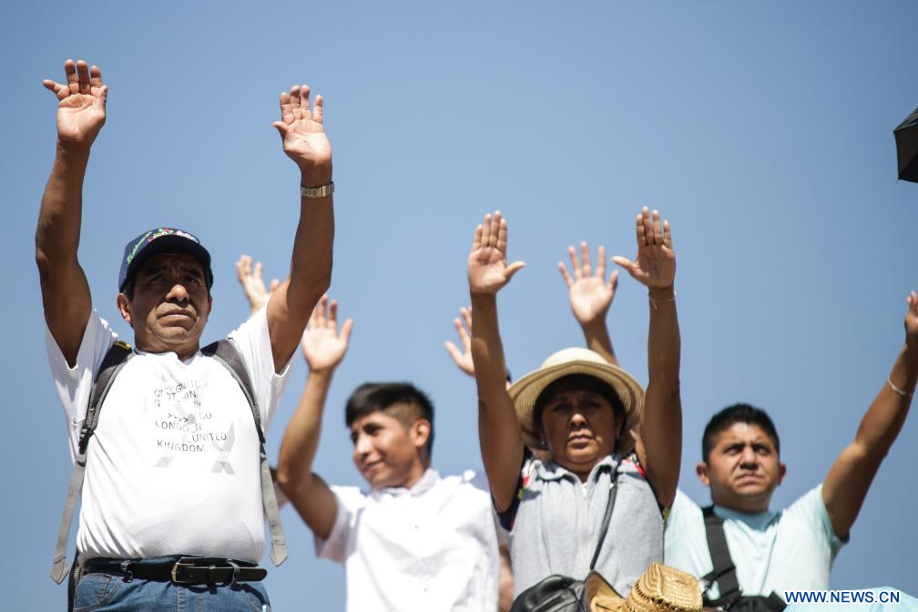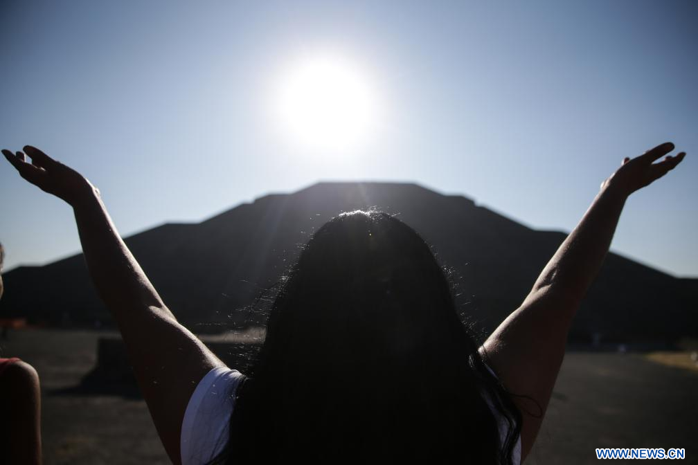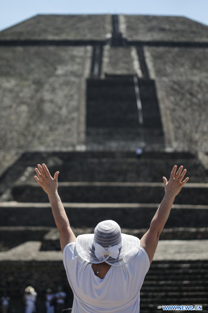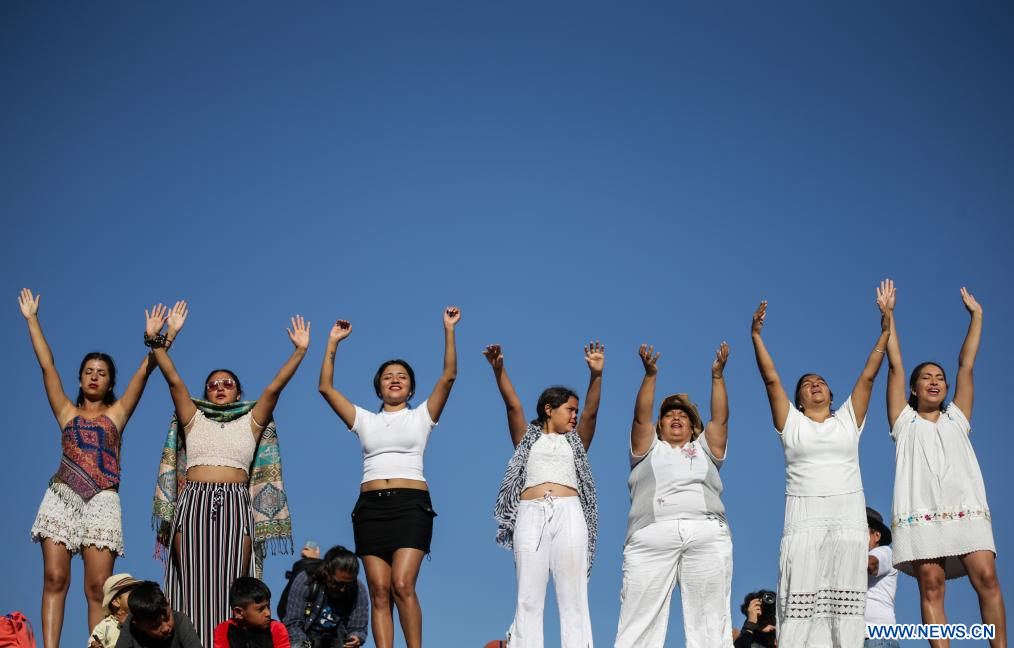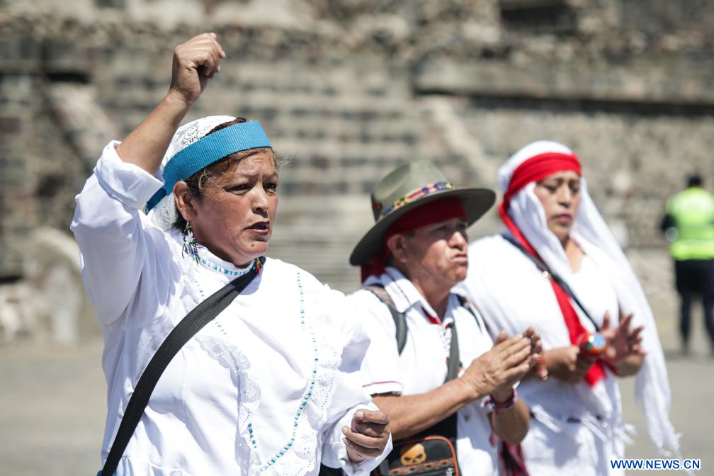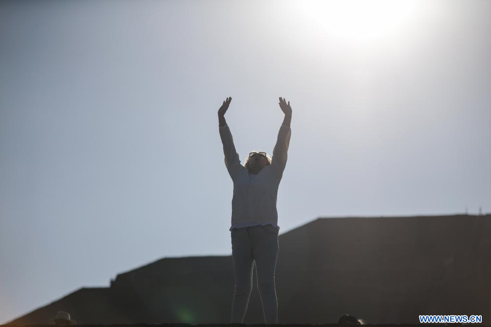 TEOTIHUACAN, 21 marzo, 2024 (Xinhua) -- Mujeres reciben los rayos del sol frente a la Pirámide del Sol en el marco del equinoccio de primavera en la zona arqueológica de Teotihuacán, en Teotihuacán, México, el 21 de marzo de 2024. (Xinhua/Francisco Cañedo)