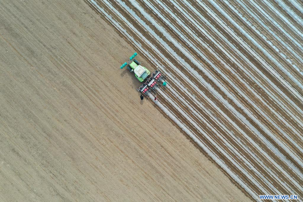 AKSU, 22 marzo, 2024 (Xinhua) -- Imagen aérea tomada con un dron el 21 de marzo de 2024 de un agricultor operando una máquina para sembrar semillas en un campo, en la aldea de Tianhai del municipio de Liuyuan, en la prefectura de Aksu, en la región autónoma uygur de Xinjiang, en el noroeste de China. Los agricultores en Aksu se encuentran ocupados recientemente con el arado de primavera, el sembrado y otras actividades agrícolas. (Xinhua/Ding Lei)