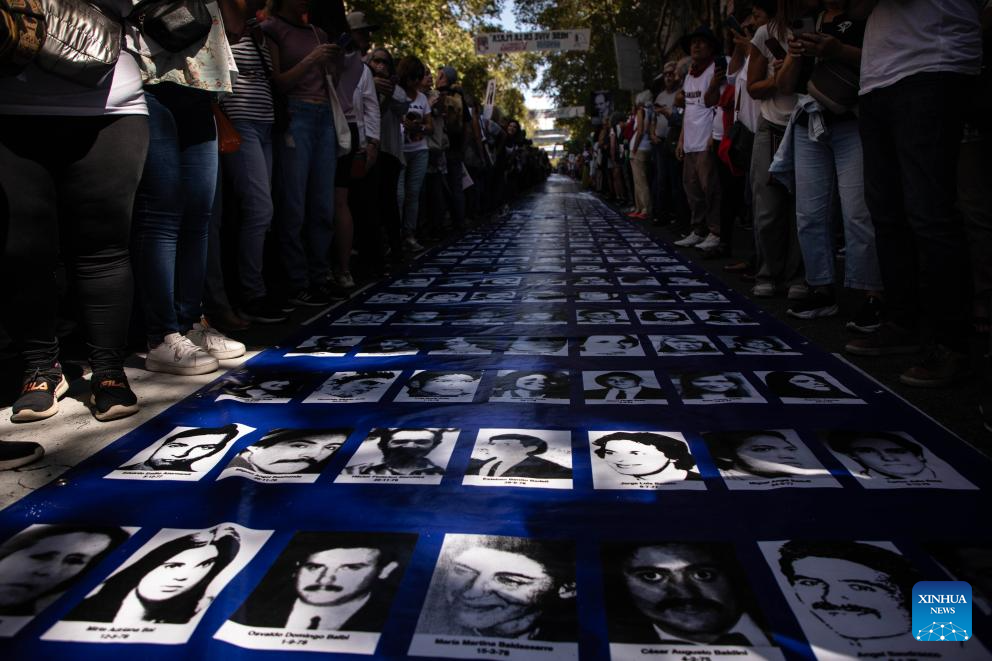BUENOS AIRES, 24 marzo, 2024 (Xinhua) -- Imagen del 24 de marzo de 2024 de una pancarta gigante con rostros de personas desaparecidas durante una manifestación en el marco del Día de la Memoria por la Verdad y la Justicia, en la ciudad de Buenos Aires, capital de Argentina. (Xinhua/Martín Zabala)