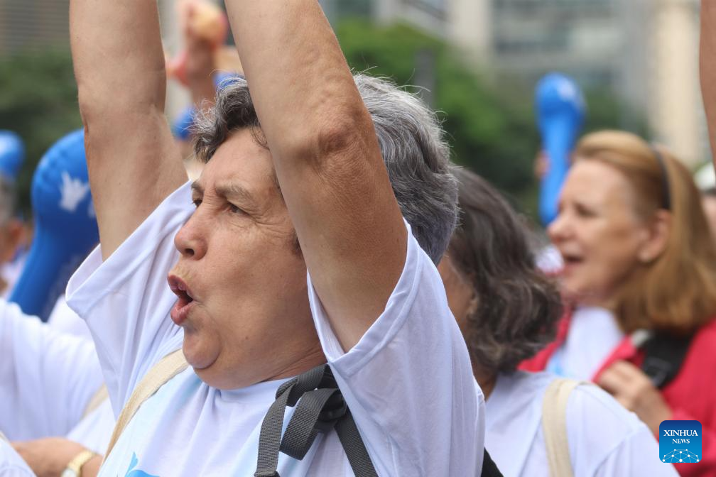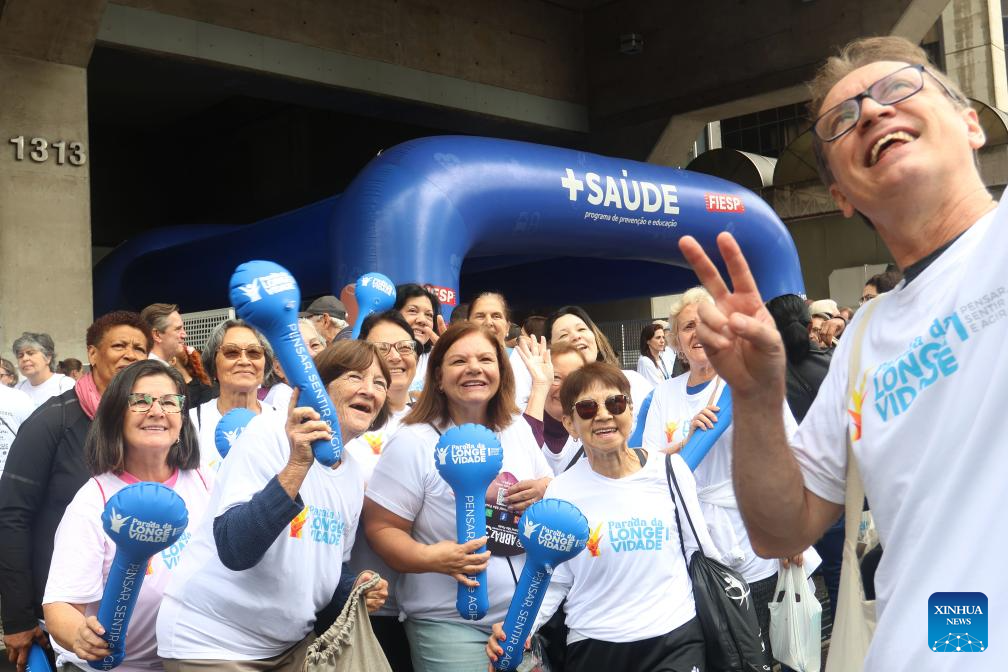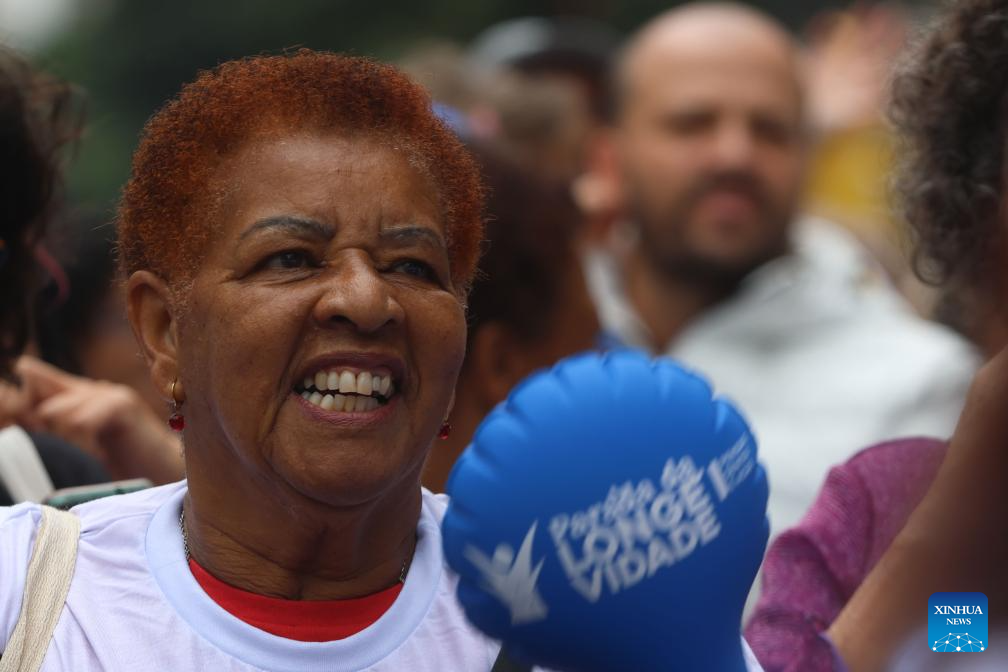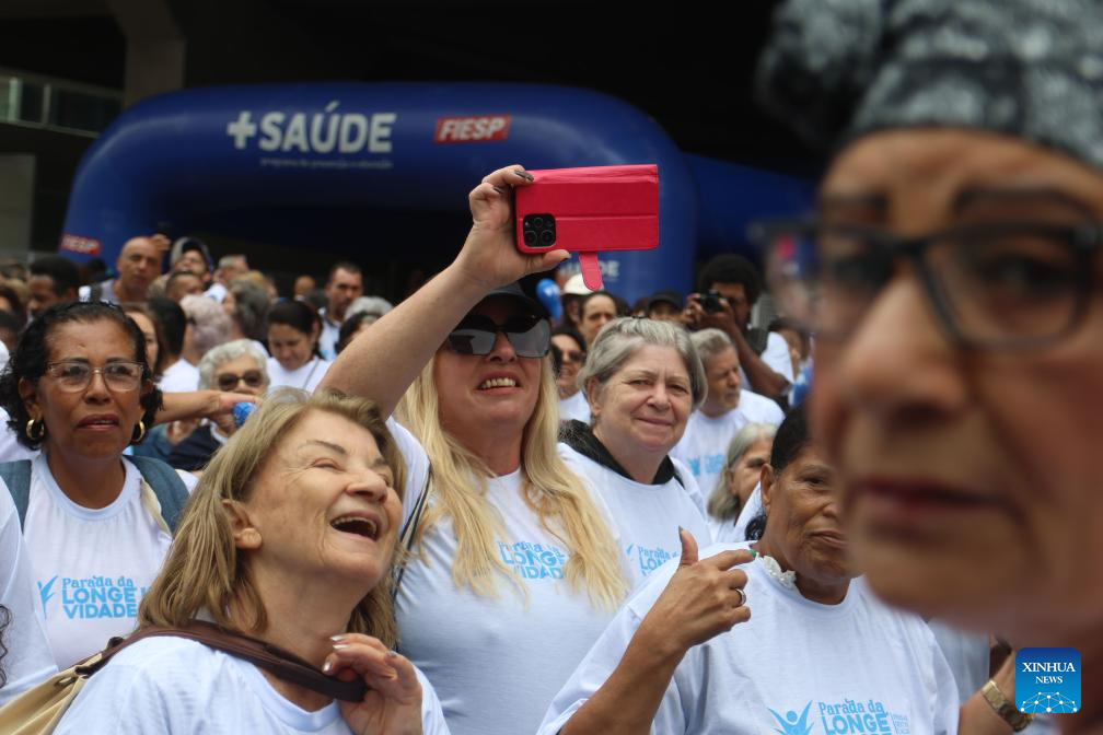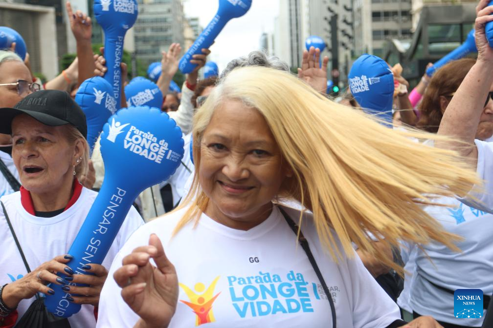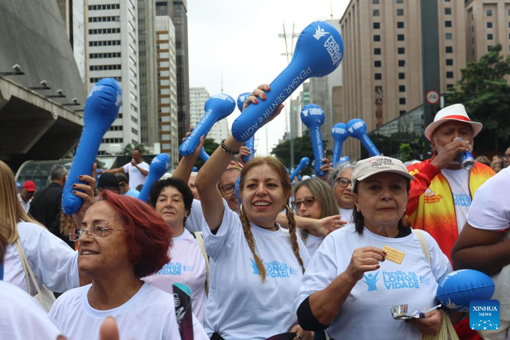 SAO PAULO, 24 marzo, 2024 (Xinhua) -- Personas participan en el "Desfile de la Longevidad", en Sao Paulo, Brasil, el 24 de marzo de 2024. (Xinhua/Rahel Patrasso)