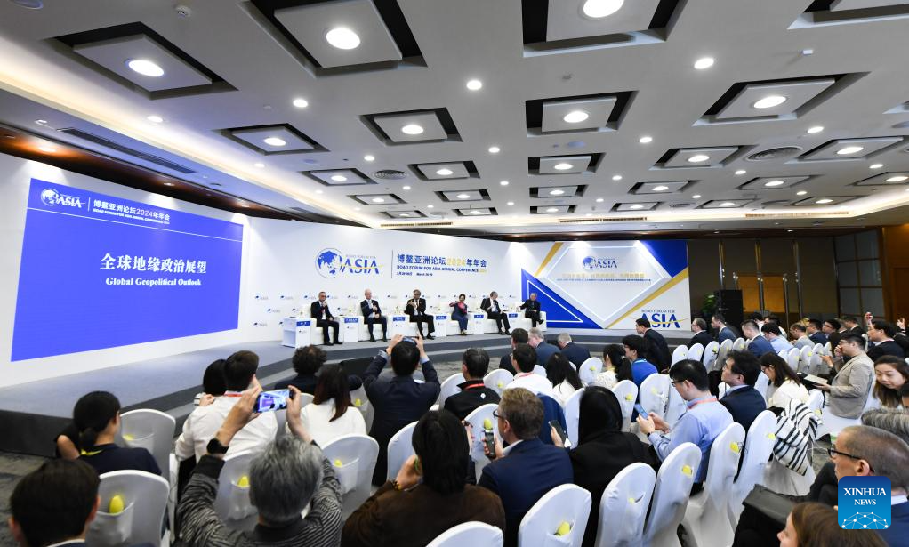 BOAO, 27 marzo, 2024 (Xinhua) -- Un panel de discusión con el tema "Perspectiva Geopolítica Global" se lleva a cabo durante la Conferencia Anual 2024 del Foro de Boao para Asia (FBA), en Boao, en la provincia de Hainan, en el sur de China, el 27 de marzo de 2024. (Xinhua/Yang Guanyu)