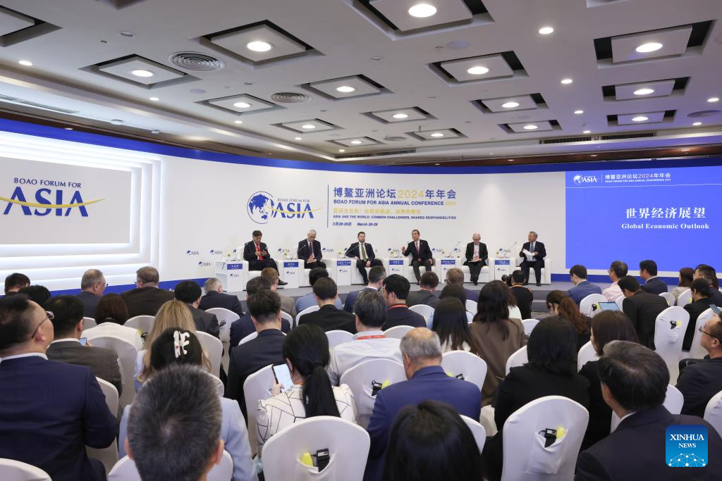 BOAO, 27 marzo, 2024 (Xinhua) -- Un panel de discusión con el tema "Perspectiva Económica Global" se lleva a cabo durante la Conferencia Anual 2024 del Foro de Boao para Asia (FBA), en Boao, en la provincia de Hainan, en el sur de China, el 27 de marzo de 2024. (Xinhua/Tang Rufeng)