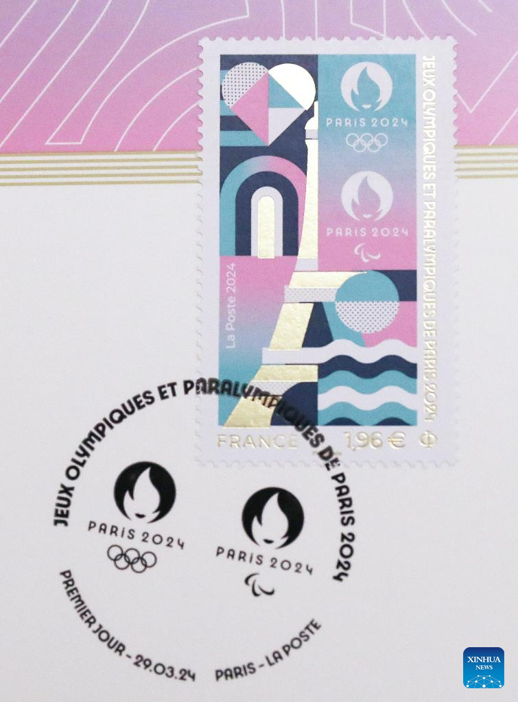 PARIS, 27 marzo, 2024 (Xinhua) -- Imagen del 26 de marzo de 2024 de la estampilla oficial de los Juegos Olímpicos y Paralímpicos de París 2024 vista durante una presentación en el Museo del Correo Francés, en París, Francia. Inspirándose en la identidad visual de los Juegos Olímpicos de París, la estampilla destaca lugares icónicos como la Torre Eiffel y el río Sena, con elementos deportivos de pistas de atletismo y rebotes de pelota en ella. La estampilla tiene acabados excepcionales con estampado en caliente. (Xinhua/Gao Jing)