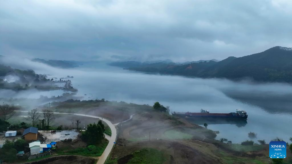 NANNING, 24 marzo, 2024 (Xinhua) -- Vista aérea tomada con un dron el 20 de marzo de 2024 del río Qianjiang, en el distrito de Wuxuan, en la ciudad de Laibin de la región autónoma de la etnia zhuang de Guangxi, en el sur de China. (Xinhua/Liang Huiye)