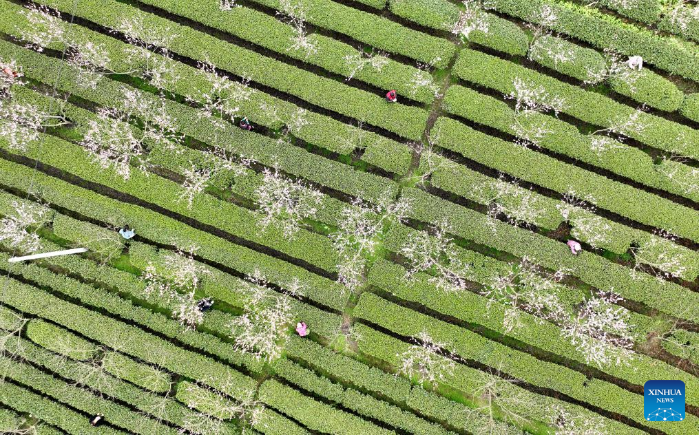 NANNING, 24 marzo, 2024 (Xinhua) -- Vista aérea tomada con un dron el 20 de marzo de 2024 de agricultores recogiendo hojas de té, en la aldea de Zhaitang, en el distrito autónomo de la etnia dong de Sanjiang, en la región autónoma de la etnia zhuang de Guangxi, en el sur de China. (Xinhua/Wu Lianxun)