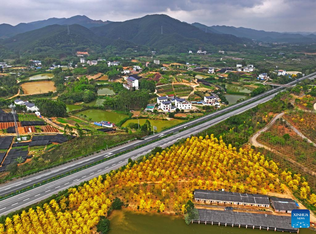 NANNING, 24 marzo, 2024 (Xinhua) -- Vista aérea tomada con un dron el 23 de marzo de 2024 del poblado de Santang, en el distrito de Xingning de la ciudad de Nanning, en la región autónoma de la etnia zhuang de Guangxi, en el sur de China. (Xinhua/Zhou Hua)