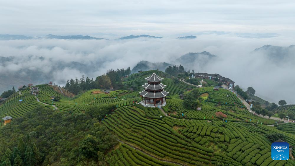 NANNING, 24 marzo, 2024 (Xinhua) -- Vista aérea tomada con un dron el 14 de marzo de 2024 de un jardín de té, en el distrito autónomo de la etnia dong de Sanjiang, en la ciudad de Liuzhou de la región autónoma de la etnia zhuang de Guangxi, en el sur de China. (Xinhua/Li Hanchi)