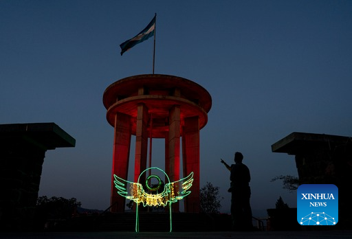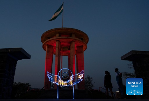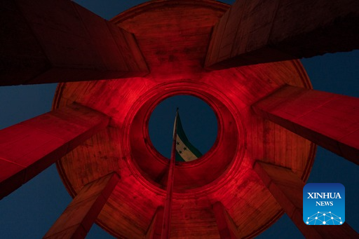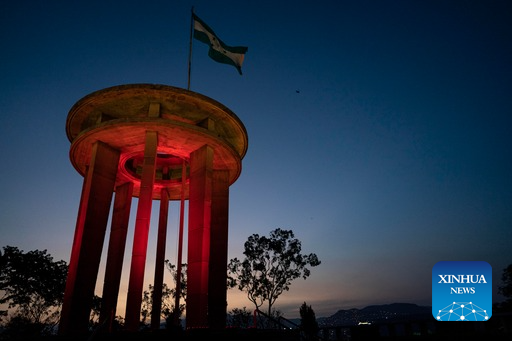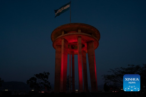 (240327) -- TEGUCIGALPA, 27 marzo, 2024 (Xinhua) -- Imagen del 26 de marzo de 2024 del Monumento a la Paz iluminado con los colores de la bandera de la República Popular China en el Cerro Juana Lainez, en la ciudad de Tegucigalpa, capital de Honduras. Honduras y China celebraron el martes el primer año del establecimiento de relaciones diplomáticas. (Xinhua/David de la Paz) (ah) (vf)