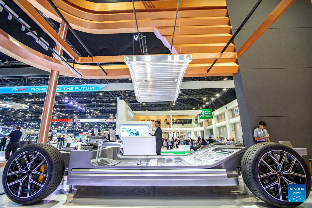 BANGKOK, 27 marzo, 2024 (Xinhua) -- Un visitante observa un BYD e-Platform 3.0 durante el 45° Salón Internacional del Automóvil de Bangkok, en Bangkok, Tailandia, el 27 de marzo de 2024. El 45° Salón Internacional del Automóvil de Bangkok comenzó aquí el miércoles y durará hasta el 7 de abril. (Xinhua/Wang Teng)