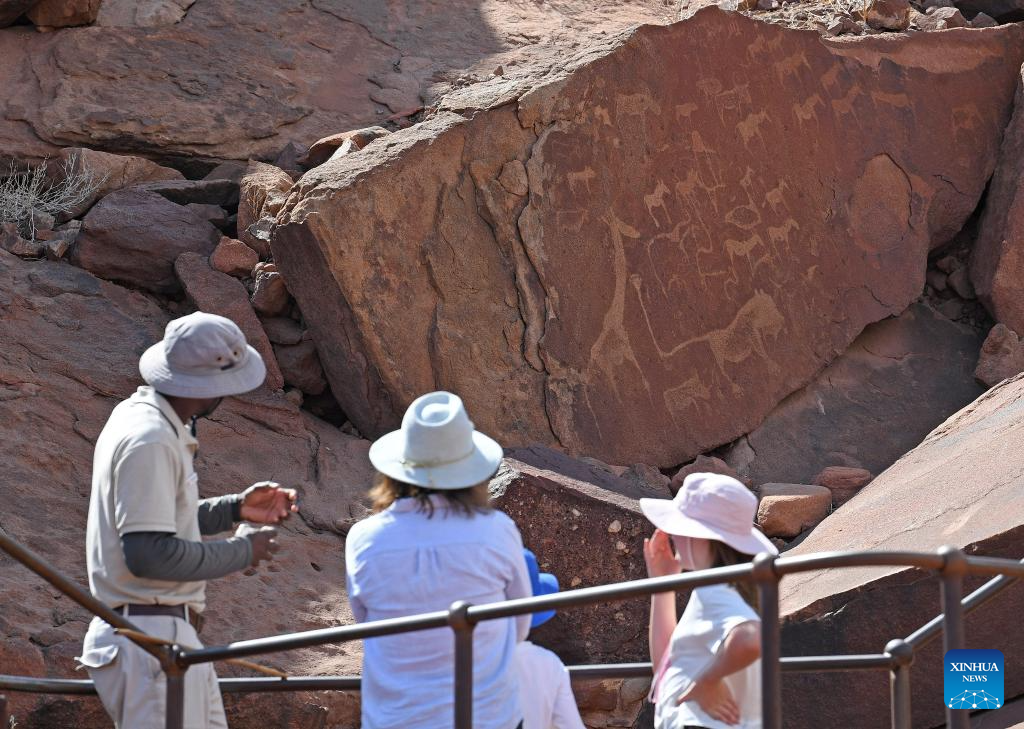 KUNENE, 27 marzo, 2024 (Xinhua) -- Imagen del 26 de marzo de 2024 de personas visitando el sitio de grabados rupestres de Twyfelfontein, en la región de Kunene, Namibia. Twyfelfontein es uno de los sitios más grandes y más concentrados de grabados rupestres en Africa hasta la fecha. El sitio fue reconocido por la UNESCO como el primer Patrimonio Mundial de Namibia en 2007. (Xinhua/Chen Cheng)