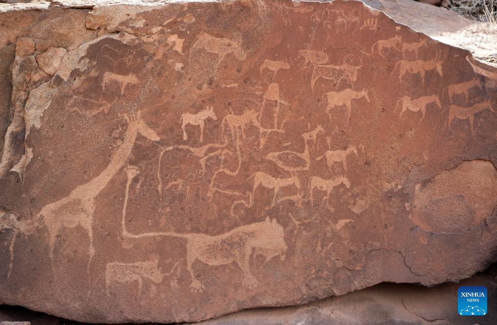 KUNENE, 27 marzo, 2024 (Xinhua) -- Imagen del 26 de marzo de 2024 de una losa grabada en el sitio de grabados rupestres de Twyfelfontein, en la región de Kunene, Namibia. Twyfelfontein es uno de los sitios más grandes y más concentrados de grabados rupestres en Africa hasta la fecha. El sitio fue reconocido por la UNESCO como el primer Patrimonio Mundial de Namibia en 2007. (Xinhua/Chen Cheng)